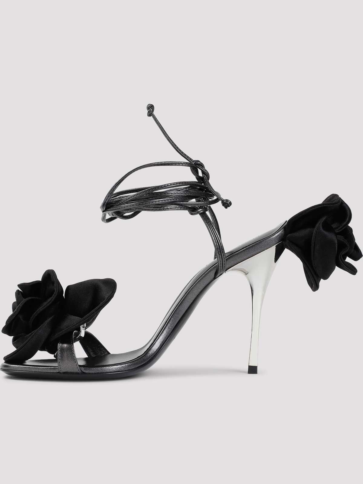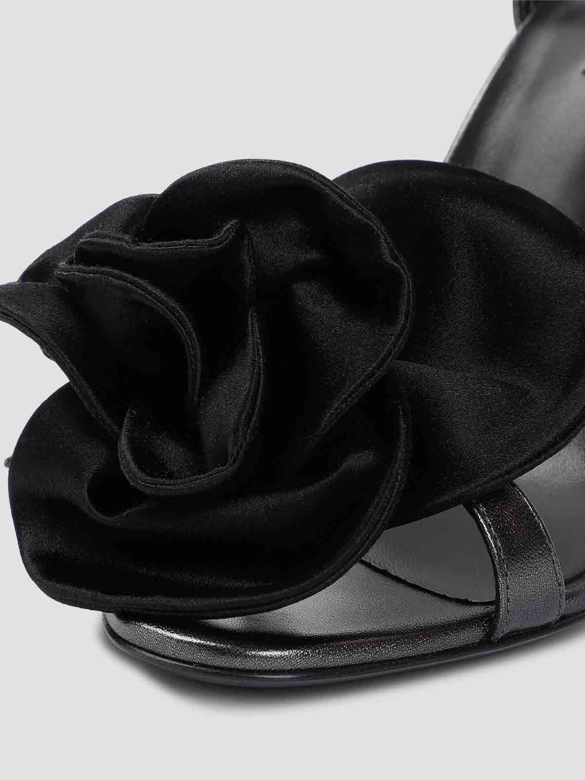 Magda butrym black calf leather flower shoes. crafted in black calf leather, round and open toe, top tonal strap, adjustable ankle straps, 3d embellishment tonal flower on the top and on the back, silver-tone logoed stiletto heel, tonal sole.