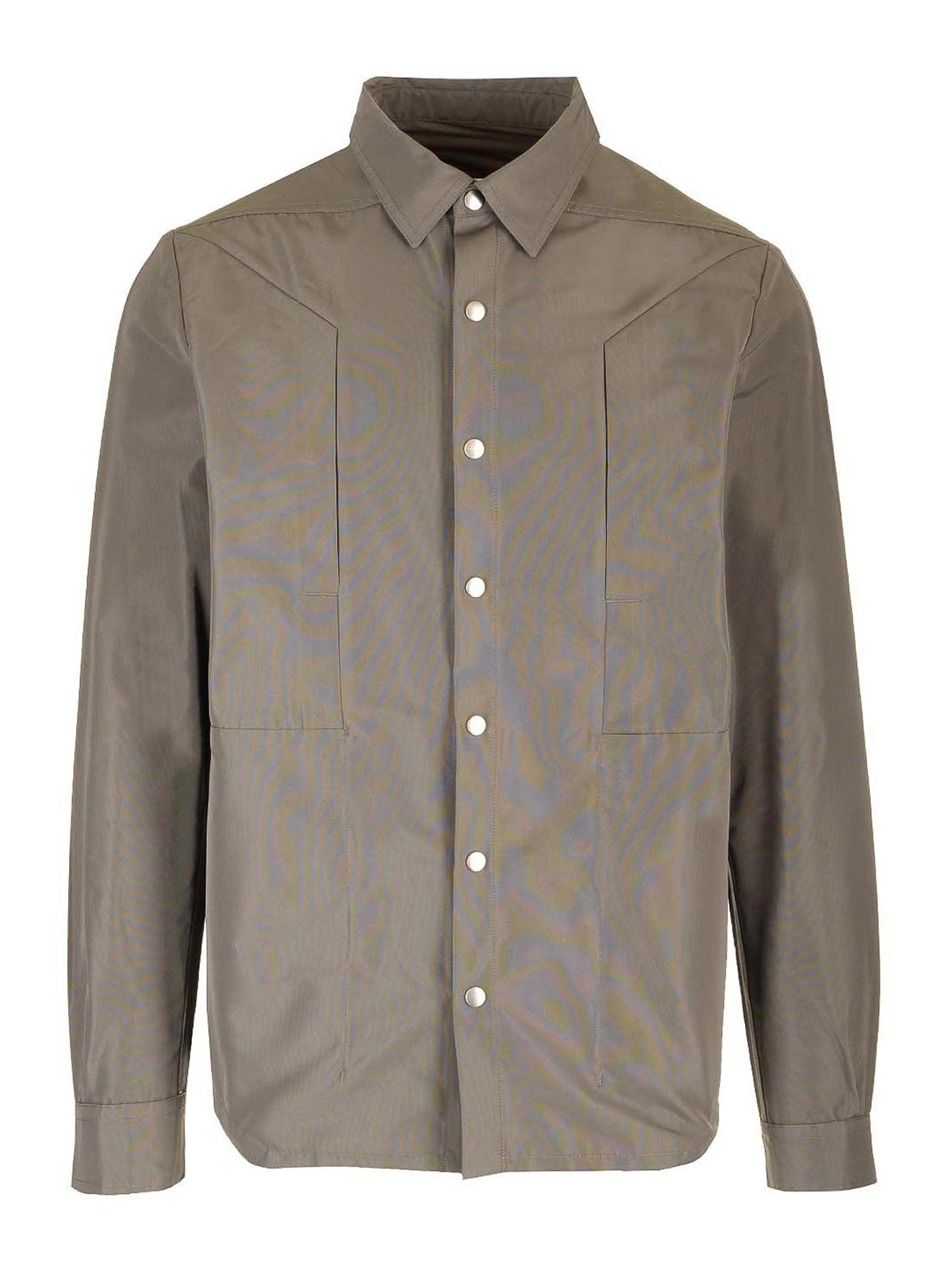 Dove grey fogpoket shirt from rick owens in light technical taffeta, hip length, boxy fit, central front opening with hidden snaps, pointed shirt collar, beveled side seams with slits, cuffs with snap and double stitching, two chest pockets with opening vertical with internal snap, shoulder seams and cotton band with rivet detail on the back yoke, unlined, two internal zip pockets.
