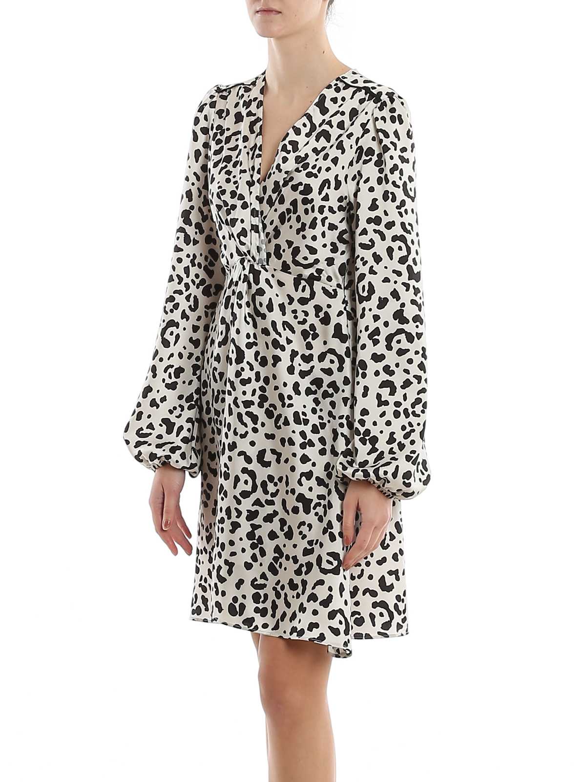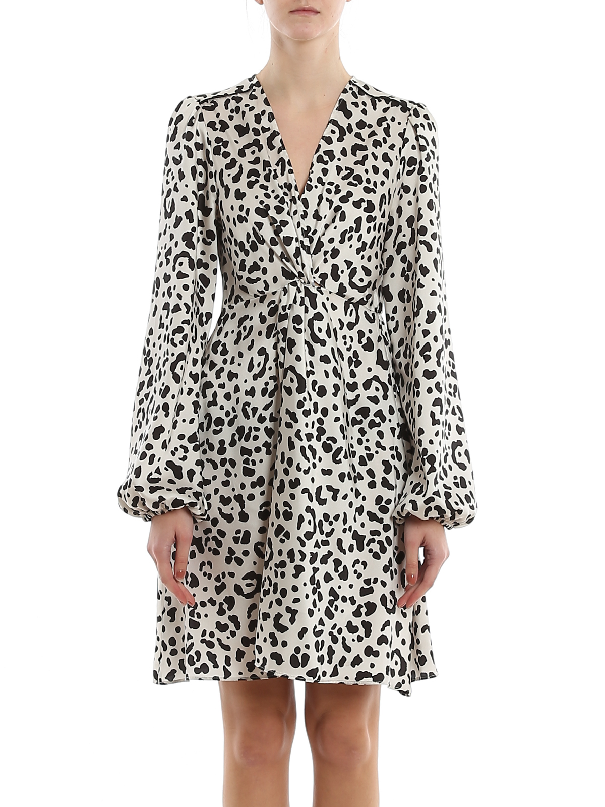 Leopard printed twill short dress featuring crossed V neck, elasticated cuffs and side zip fastening.