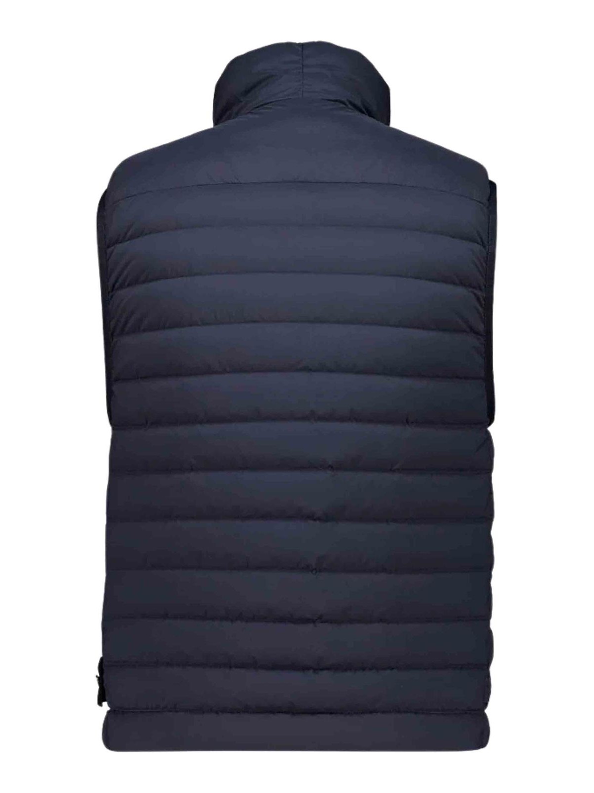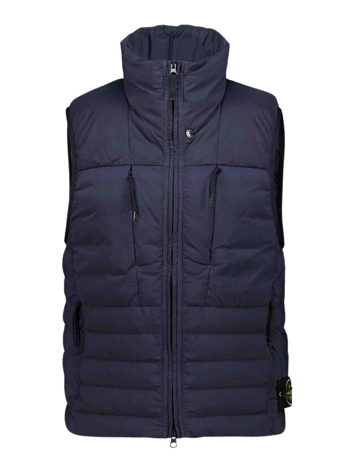 quilted nylon vest, stone island, model g100004 fabric: lightweight down-filled nylon pattern: solid color sleeves: sleeveless neck: high-necked closure: front with two-way zip and top button pockets: two side zip pockets and two chest zip pockets details: horizontal quilting, stone island logo on the left side, tone-on-tone trim lined: yes fit: regular