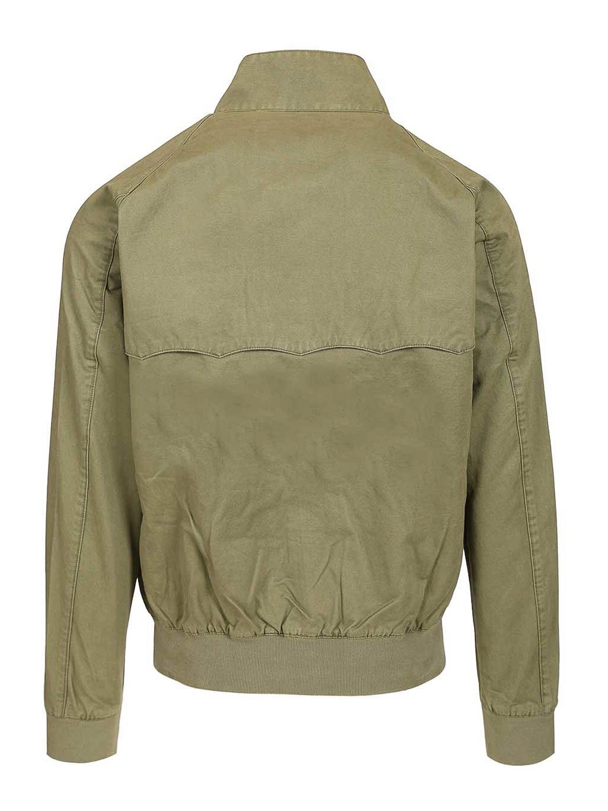 g twill jacket in washed twill by baracuta featuring an umbrella, patterned yoke a tone, on, tone fine, ribbed stand, up collar with a double button a double, slider zip with a logo raglan sleeves two diagonal pockets with a single button tone, on, tone fine, ribbed cuffs and waistband an pocket and featuring a custom baracuta button and a tartan