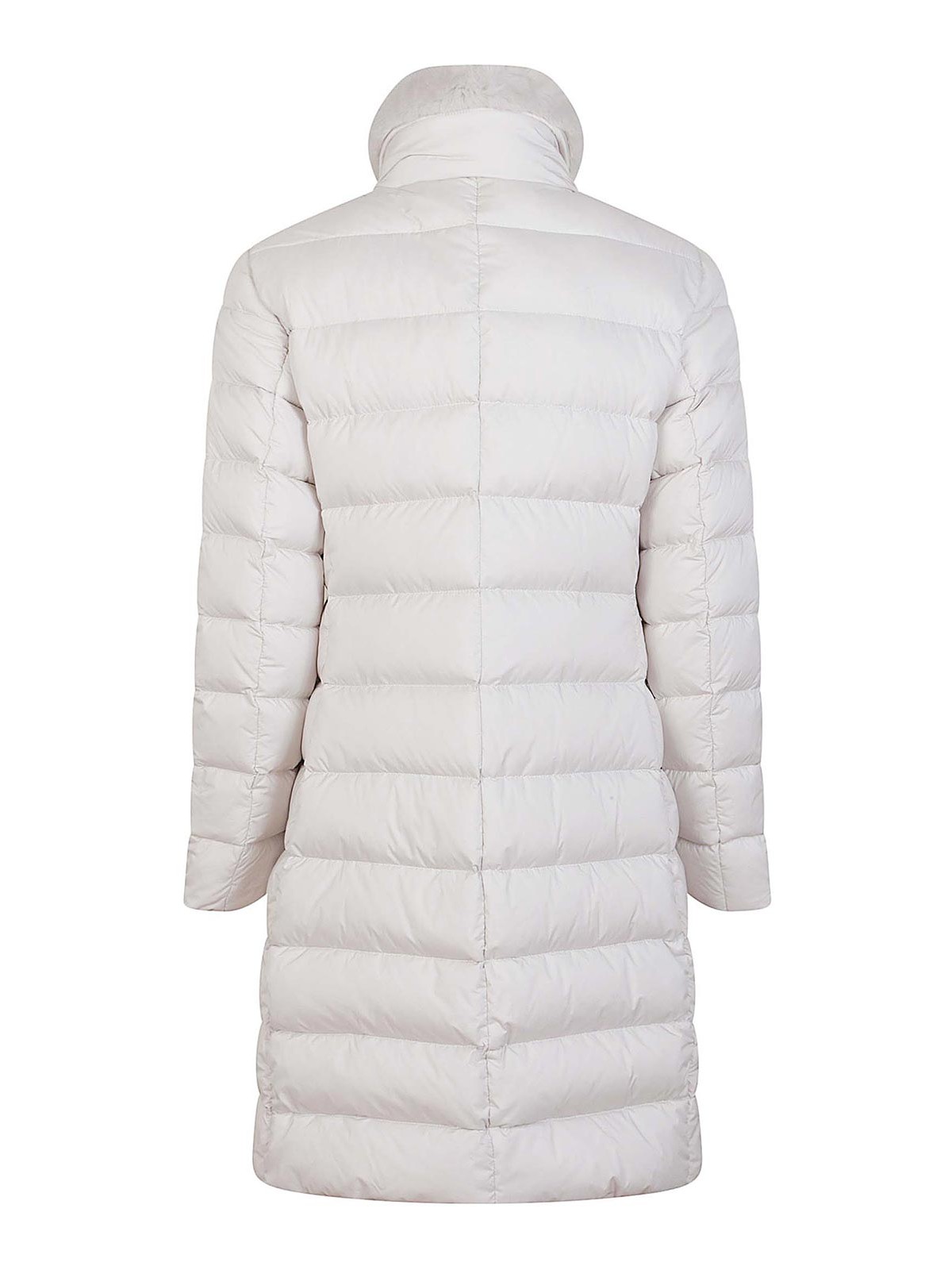 In ivory colored waterproof nylon, collar with removable fur and leather clamp, zip and button fastening, padded with goose down, flap pockets.