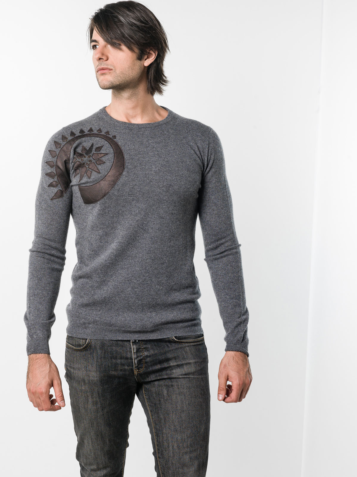 Gray round neck sweater in cashmere with right chest leather patch, elasticated cuffs and bottom
