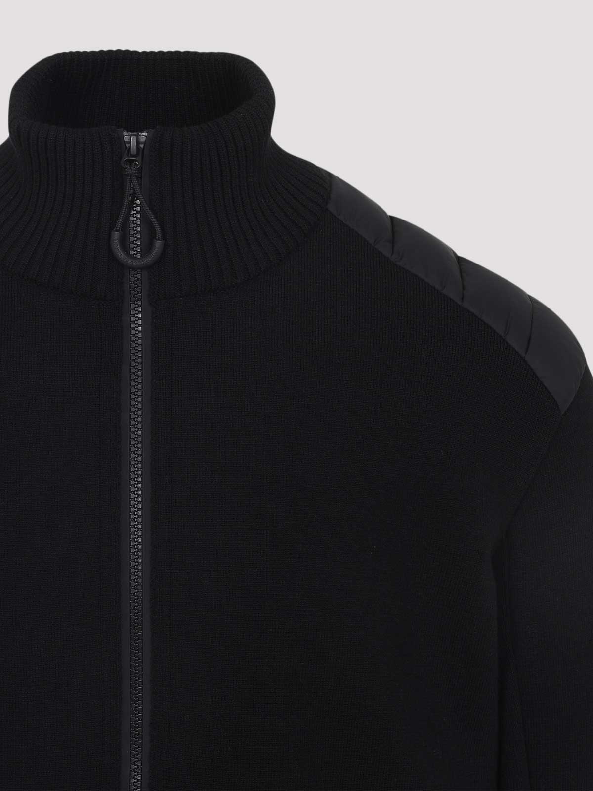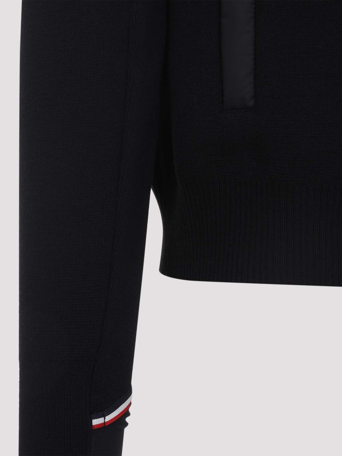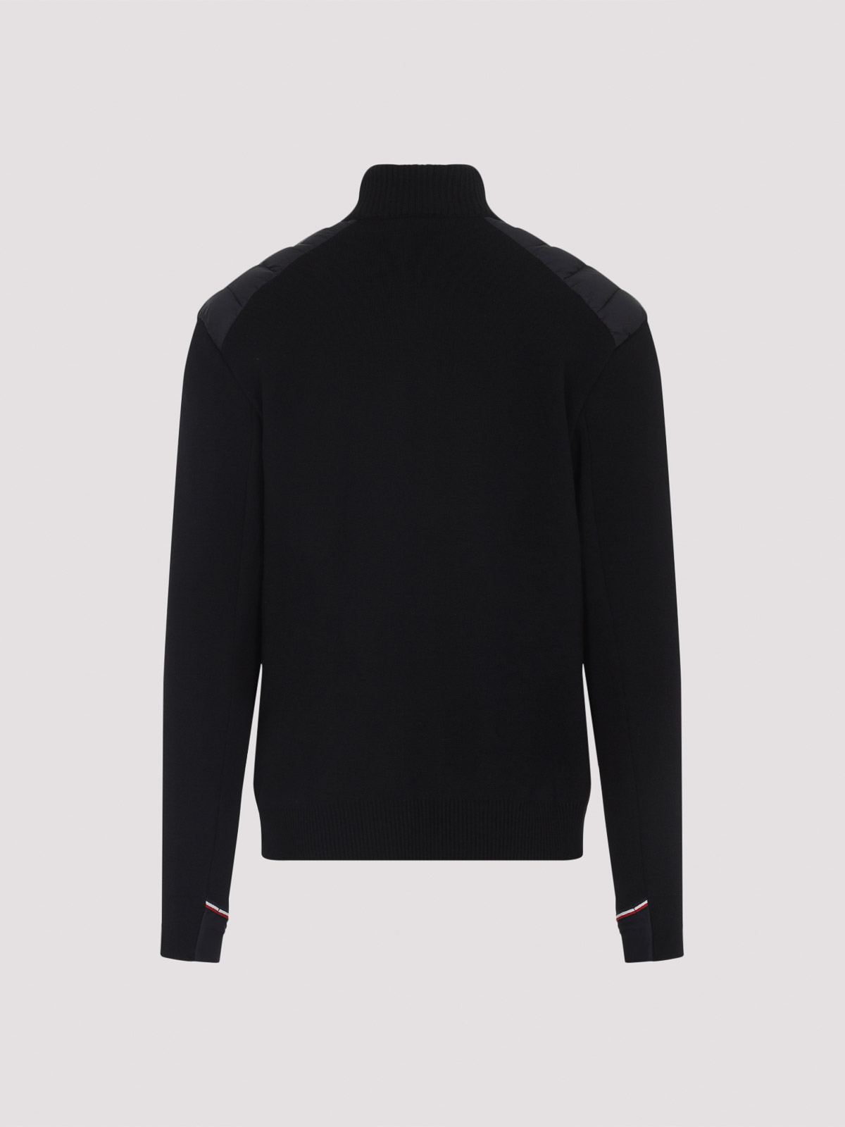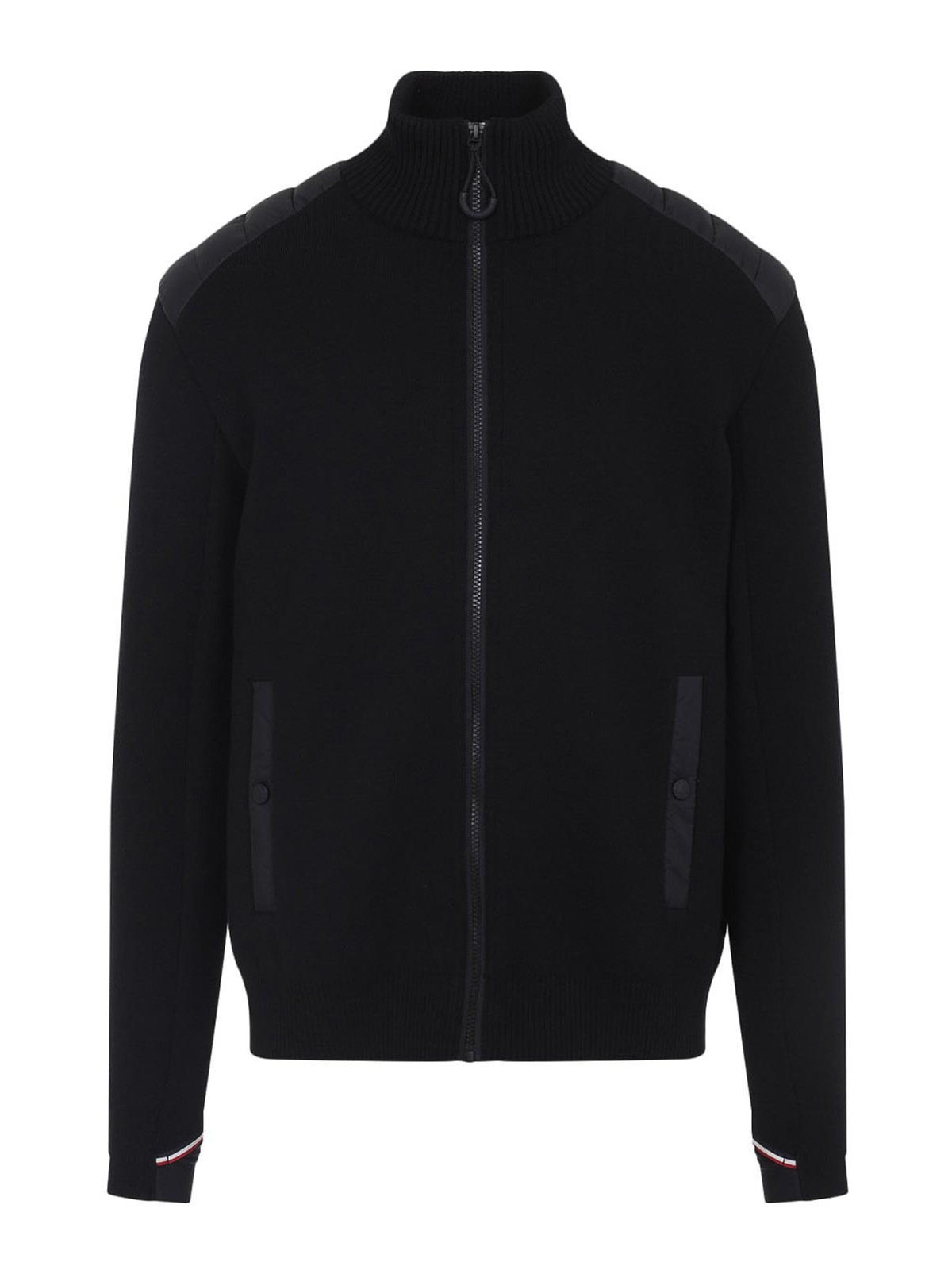 Moncler grenoble black cardigan crafted and blend stand, up ribbed collar zipped side pockets padded shoulders long sleeves white and red stripe on the cuffs ribbed straight hem