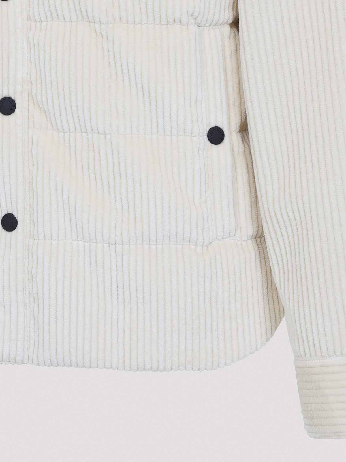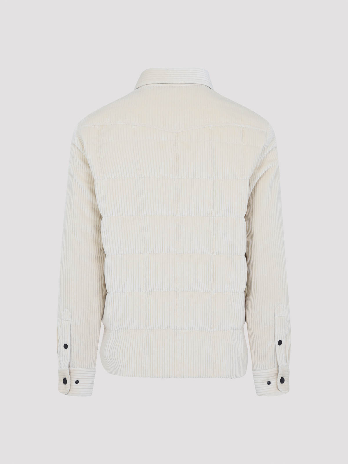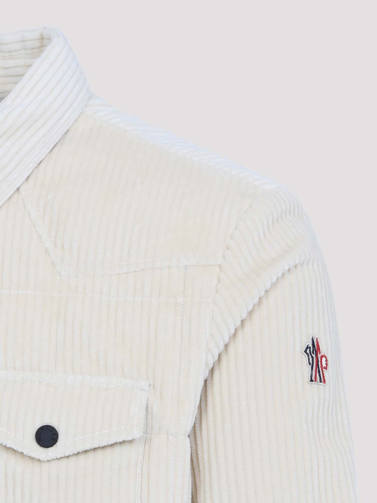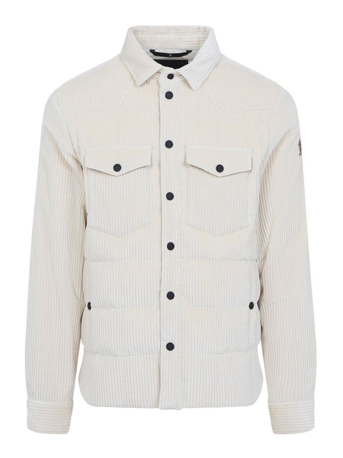 Moncler grenoble miscellaneous white gelt shirt jacket crafted and blend pointed collar contrasting black buttoned chest flap buttoned pockets long sleeves patch logo on the right buttoned cuffs straight hem design