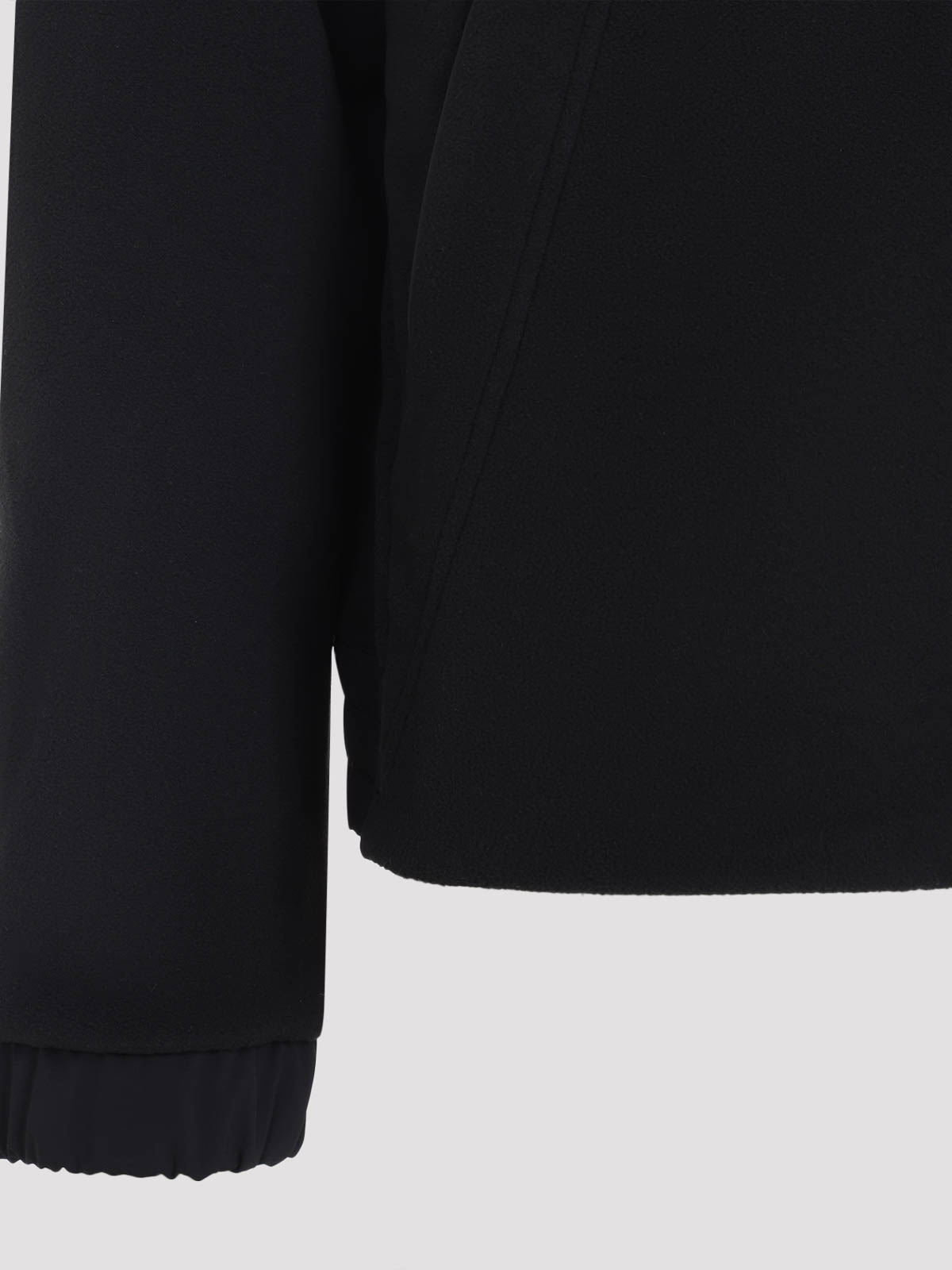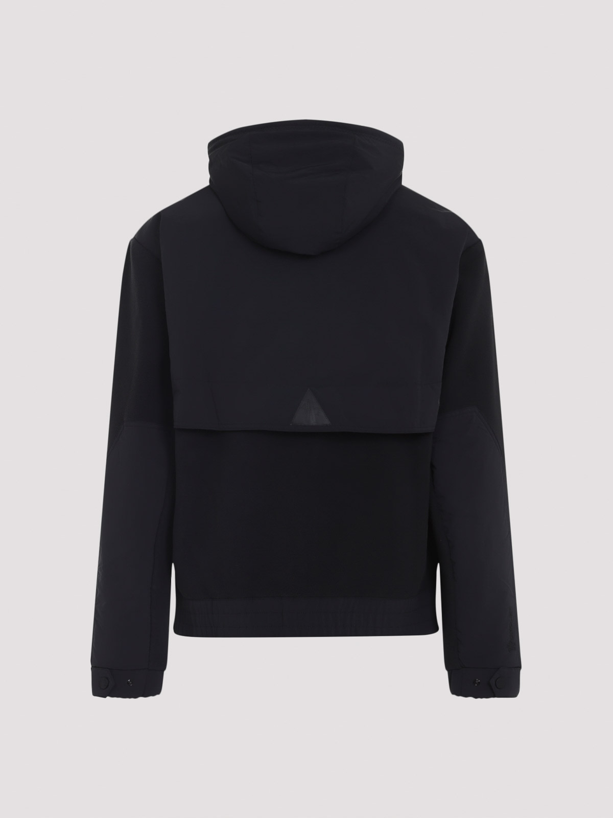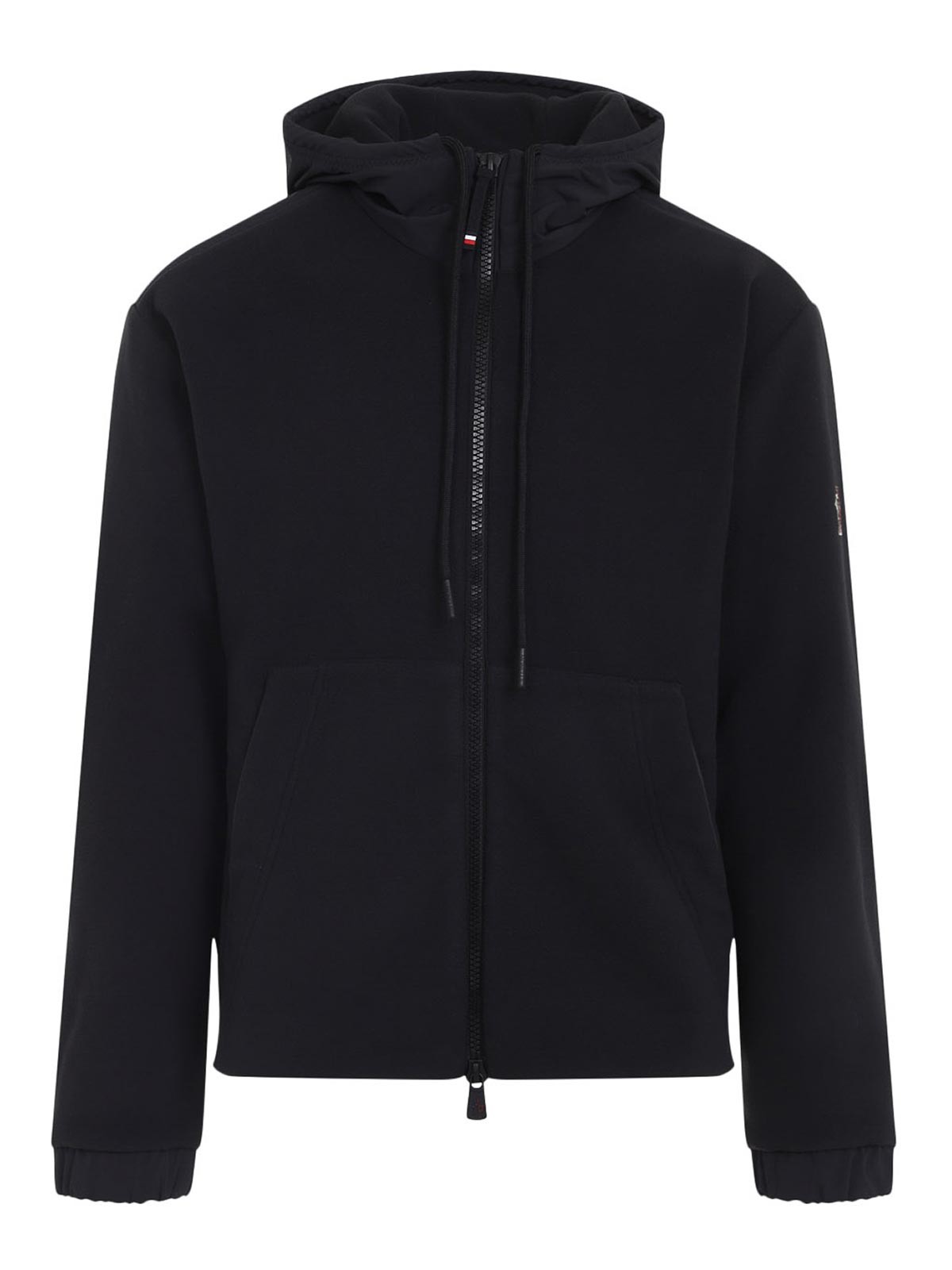 Moncler grenoble zip up black jacket crafted from black fleece and hood with drawstring two, way zip kangaroo pocket logo patch on the back yoke elastic and adjustable cuffs elastic hem