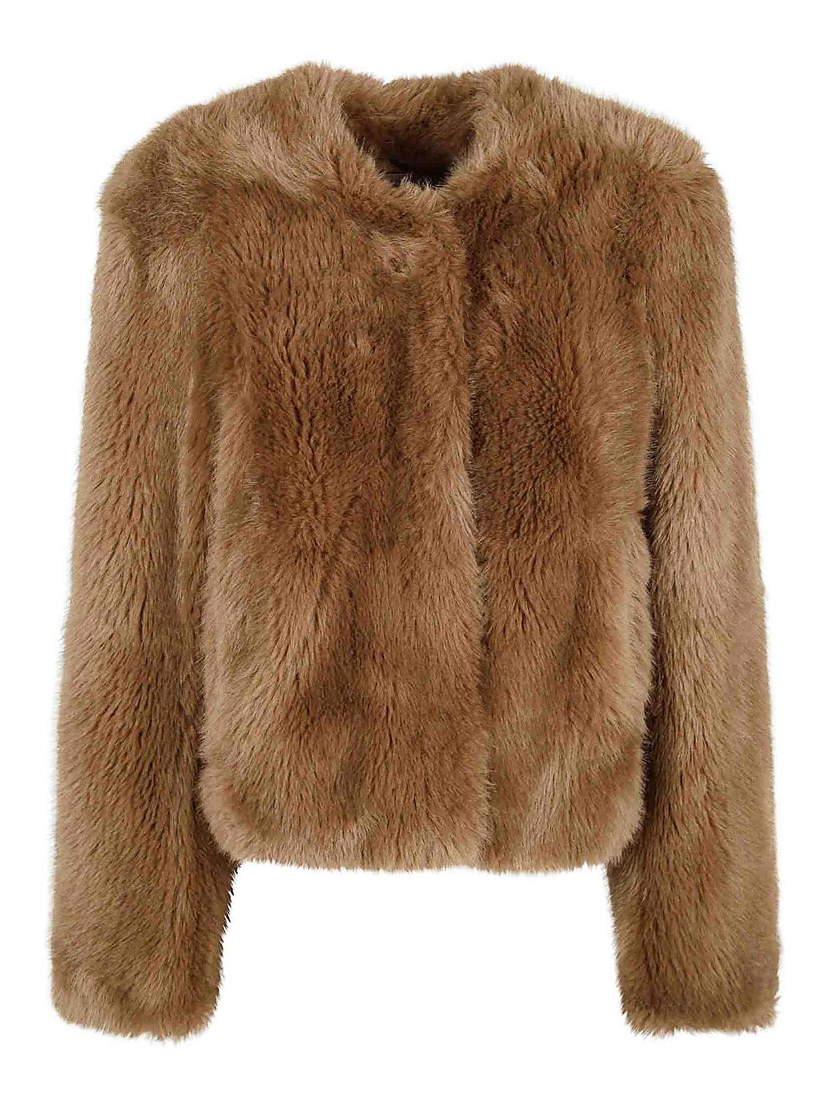 camel synthetic fur jacket, round neck, hidden front closure, long sleeves