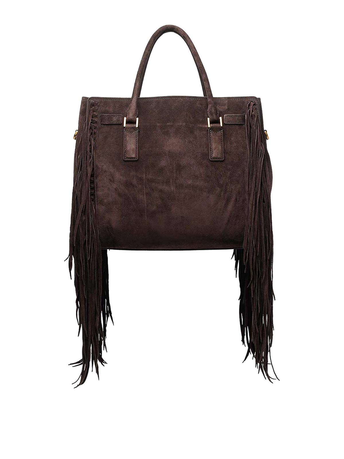 Michael michael kors dark chocolate hamilton satchel bag, zip closure, 2 inner open pockets, adaptable and removable strap, fringes