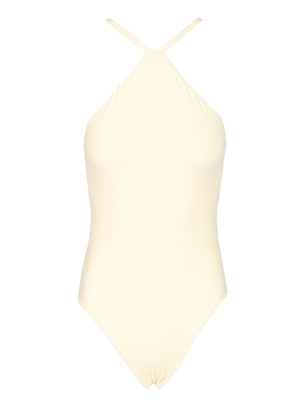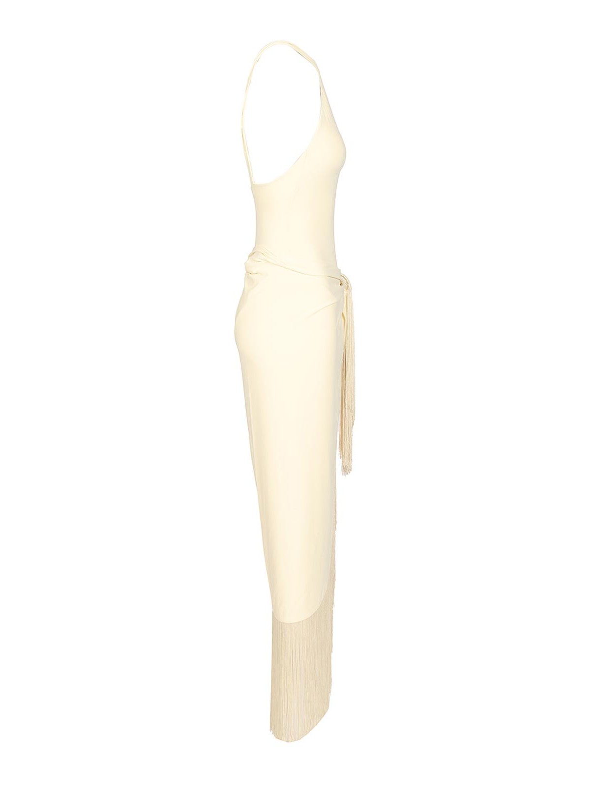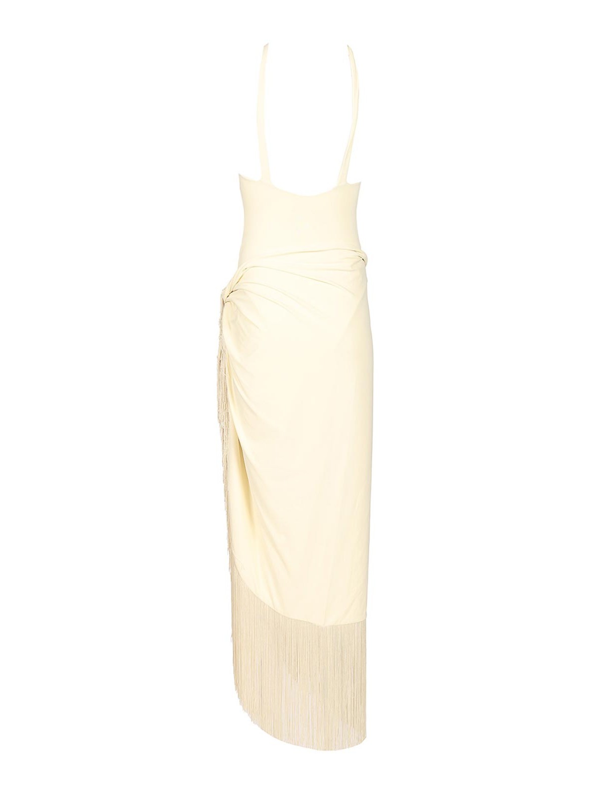 hera artisanal swimsuit by taller marmo with halter neckline paired with a long detachable pareo embellished with hand, tied tone, on, tone fringes