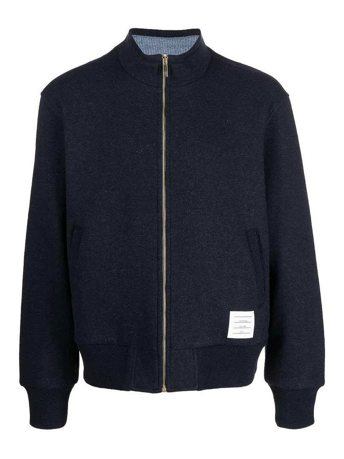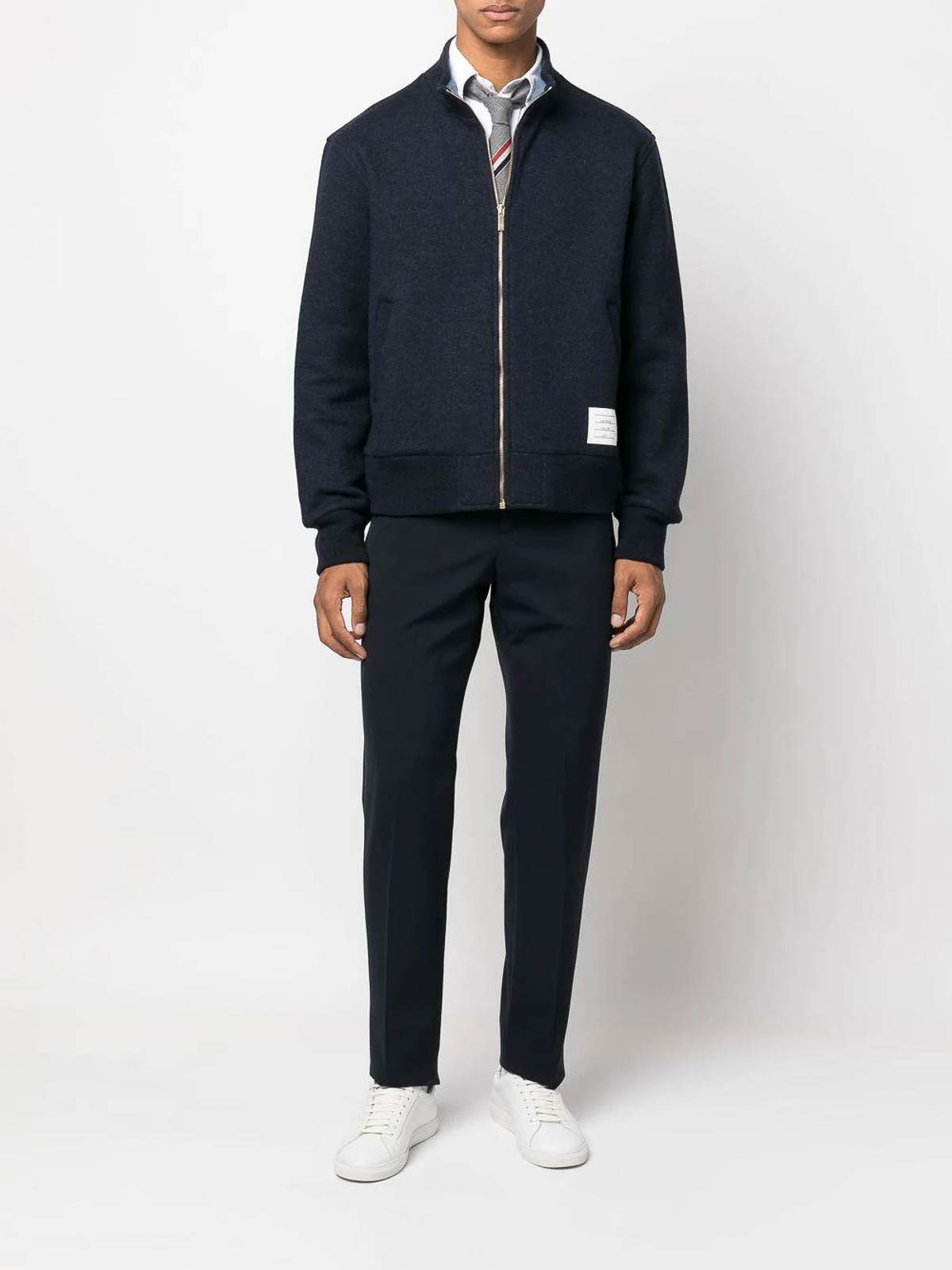 Thom browne elevates the sporty bomber jacket with a signature sophisticated style cut from a blend the tonal navy piece has an elegant high neck design and structured silhouette navy blue blend logo patch to the side high neck