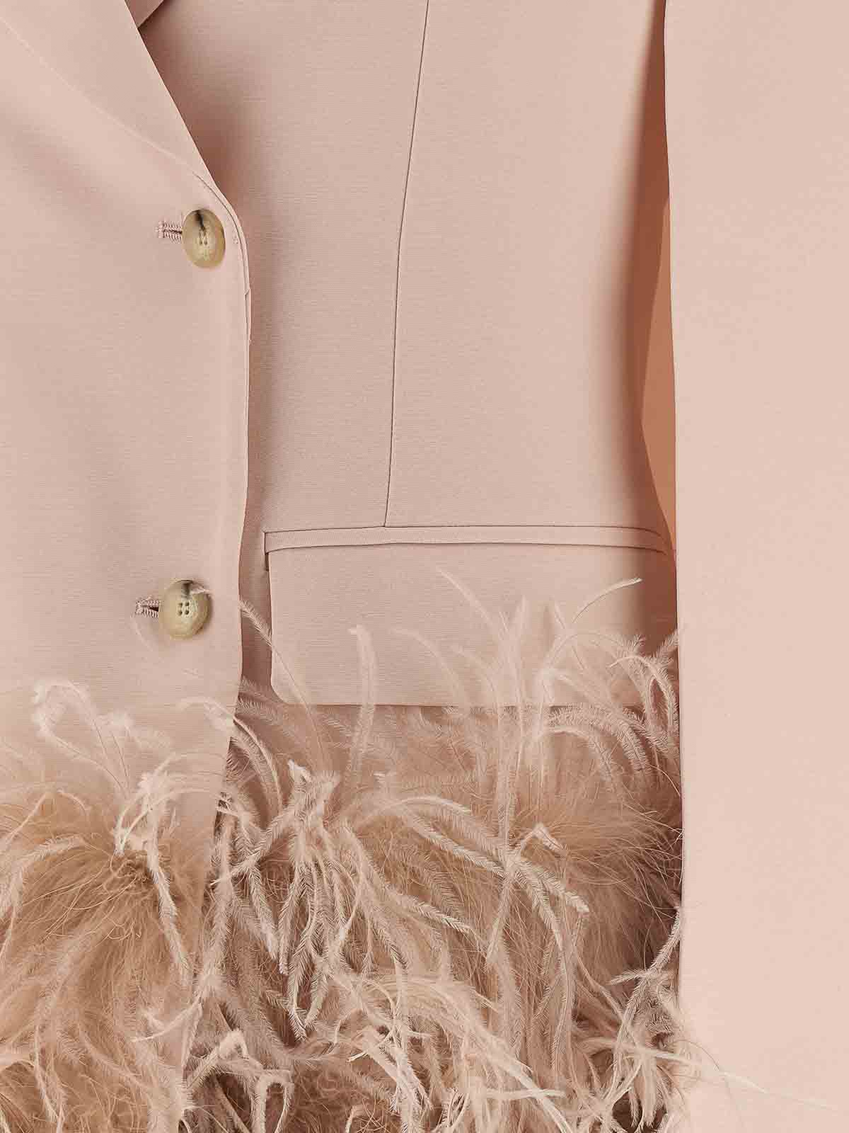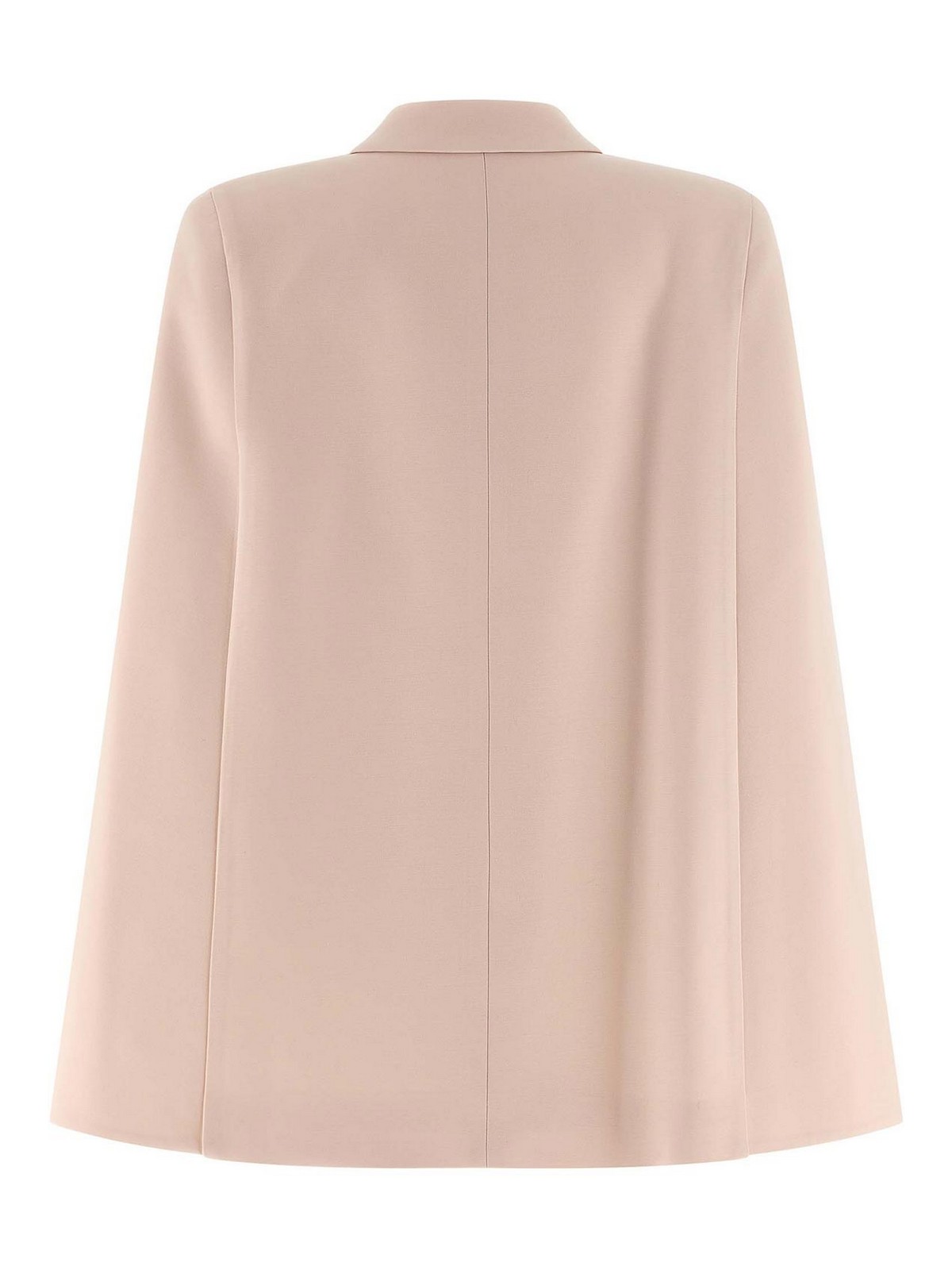 Wool and silk blazaar consisting of a central vest, double-breasted model with front button closure, peak lapels, breast pocket, flap pockets, back split, head hem with front feather application and upper cape with structured shoulder strap.