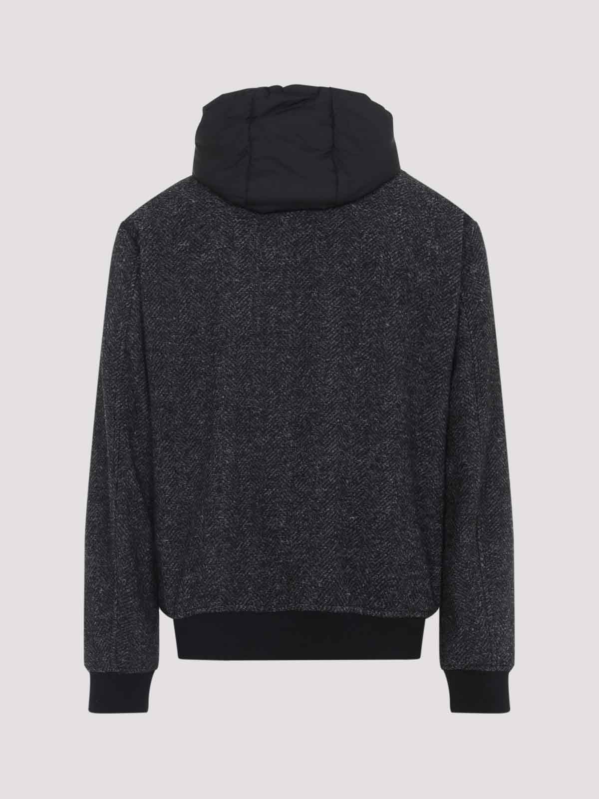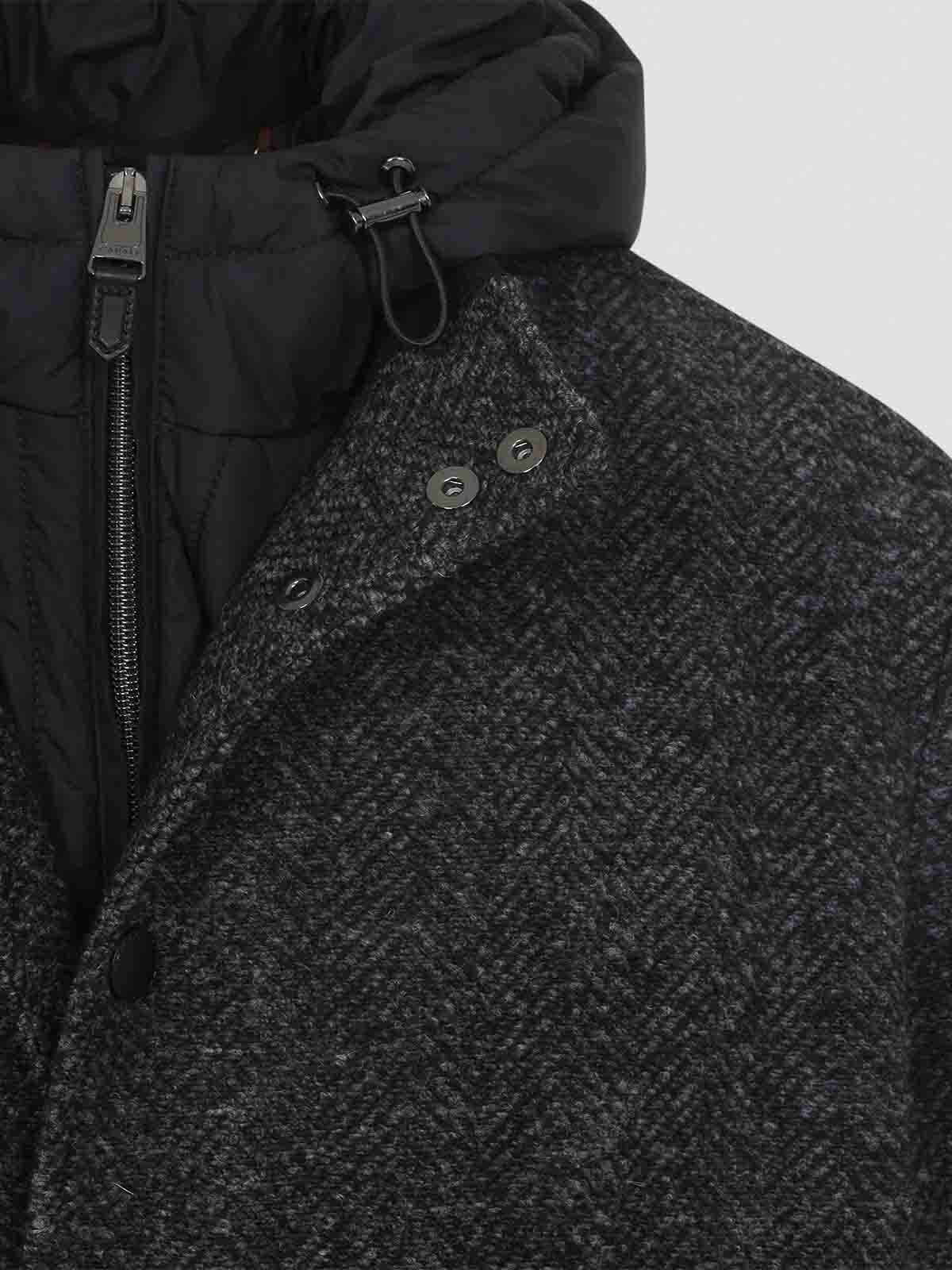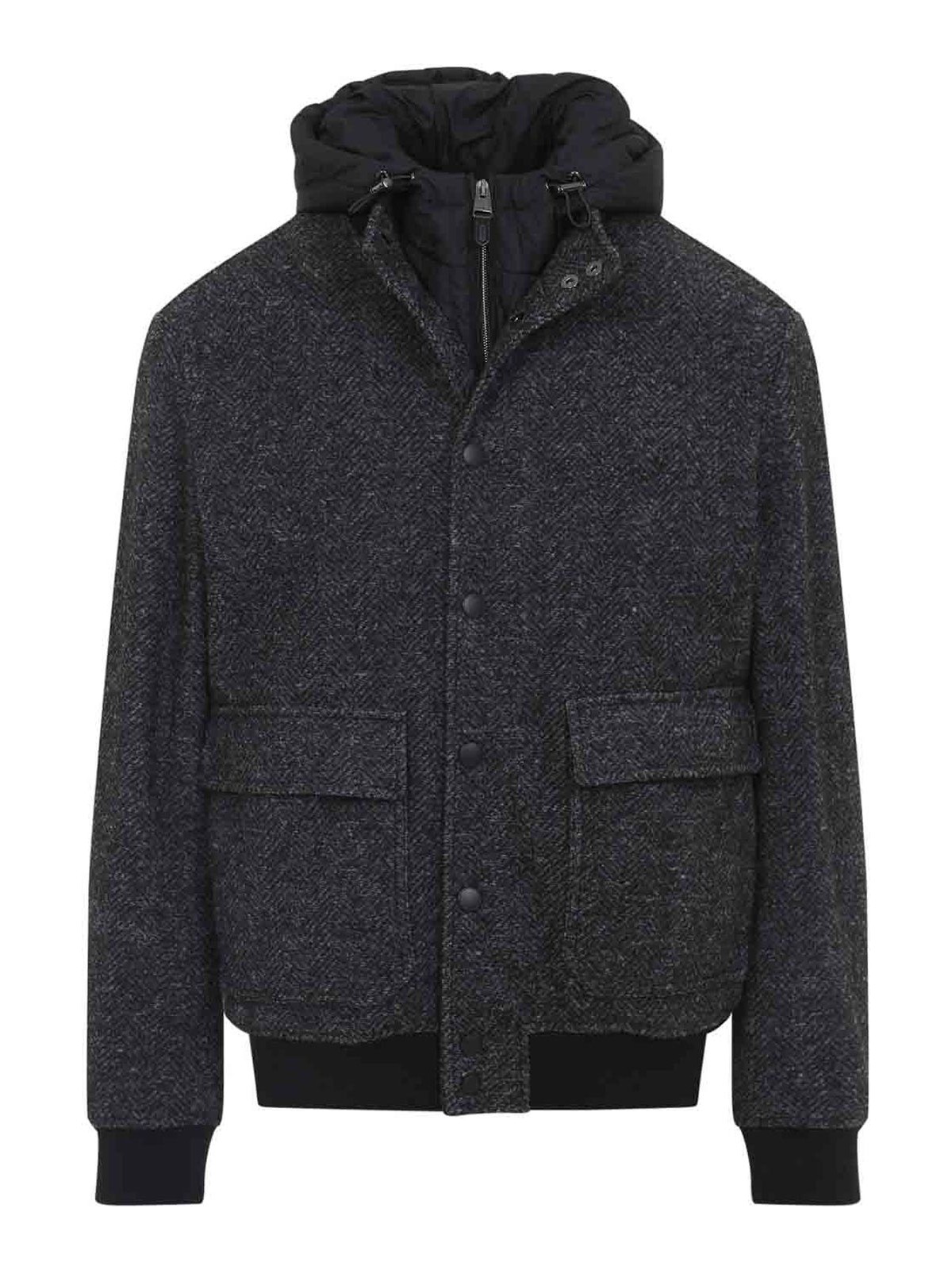 Canali hoodie dark grey viscose bomber jacket. 3in1 bomber jacket. outer layer crafted from dark grey herringbone wool, featuring a high collar, front button fastening, long sleeves, two front pockets, and ribbed edges. the inner layer is a padded vest with an adjustable hood, front zip fastening, and two front pockets.