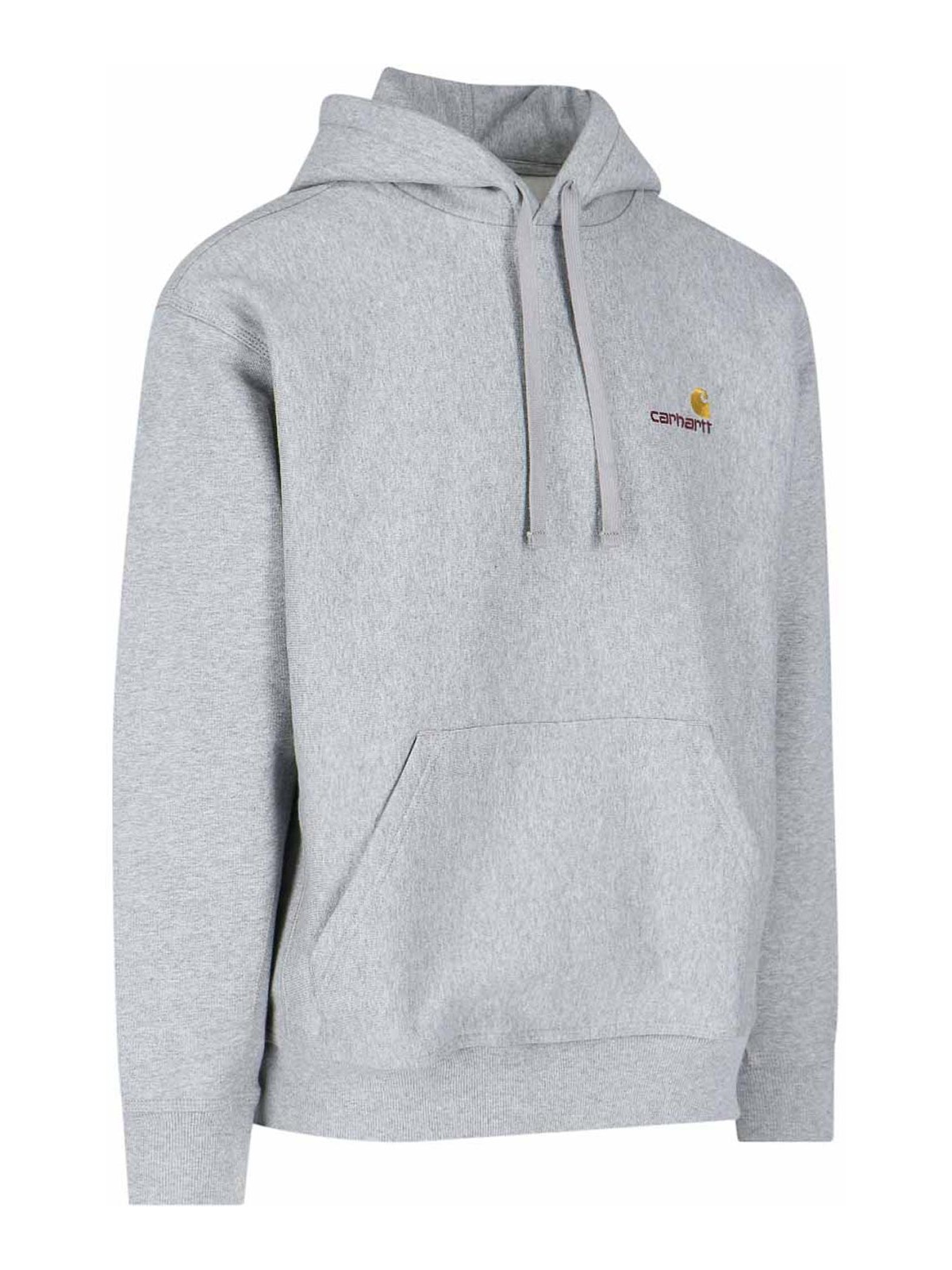 Carhartt wip american script hoodie, in gray cotton blend, drawstring, two-tone chest logo embroidery, one maxi front pocket, ribbed hem and cuffs, straight hem.