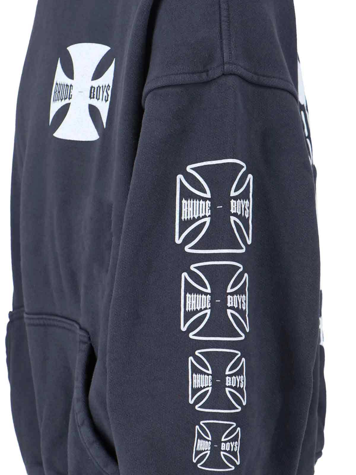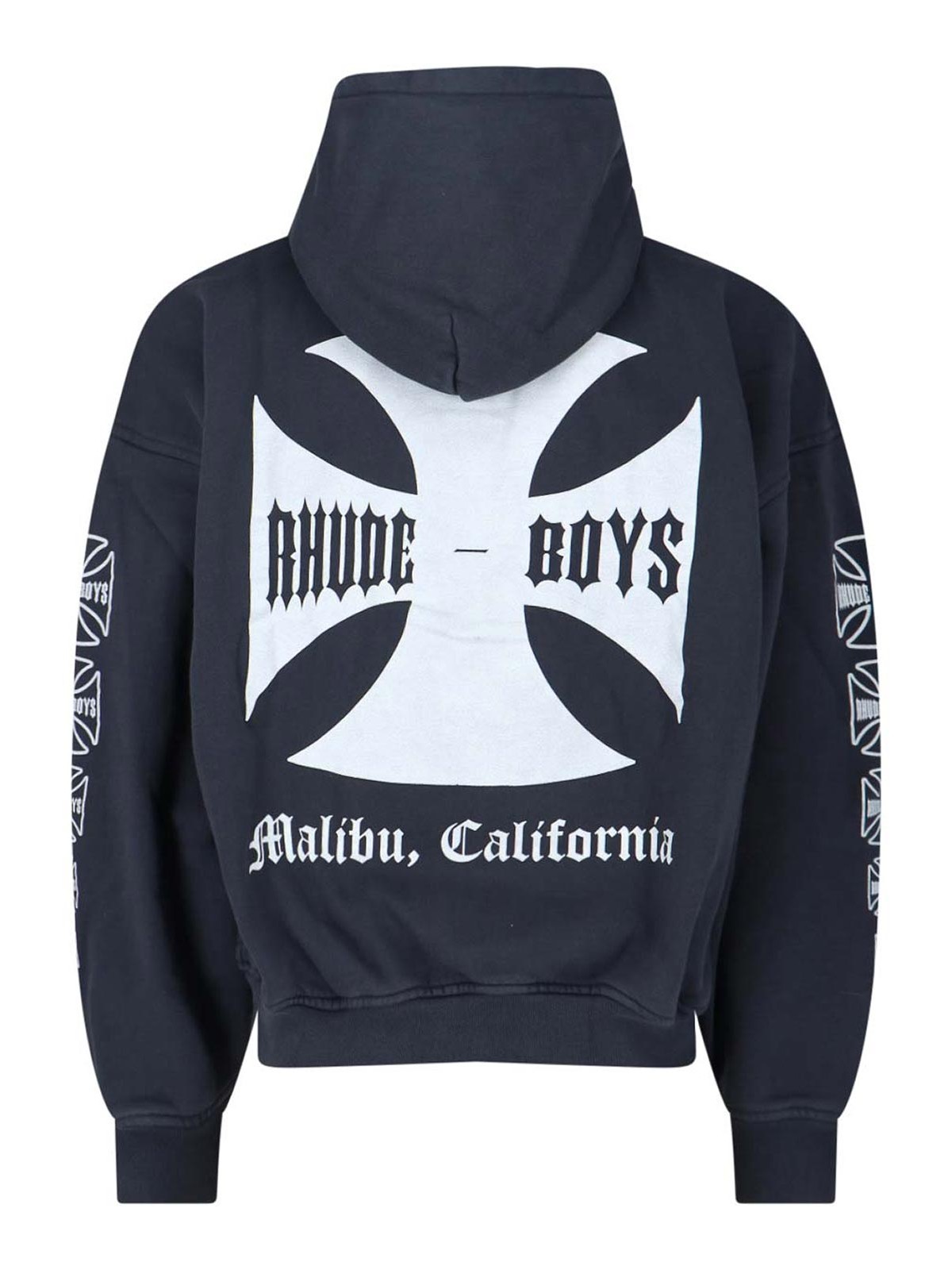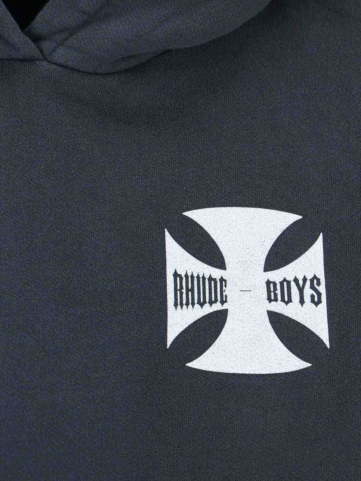 Boys rhude hoodie, in black cotton jersey, contrasting print on the front, maxi pocket on the front, contrasting print on the sleeves, maxi contrasting print on the back, ribbed finishes, straight hem.