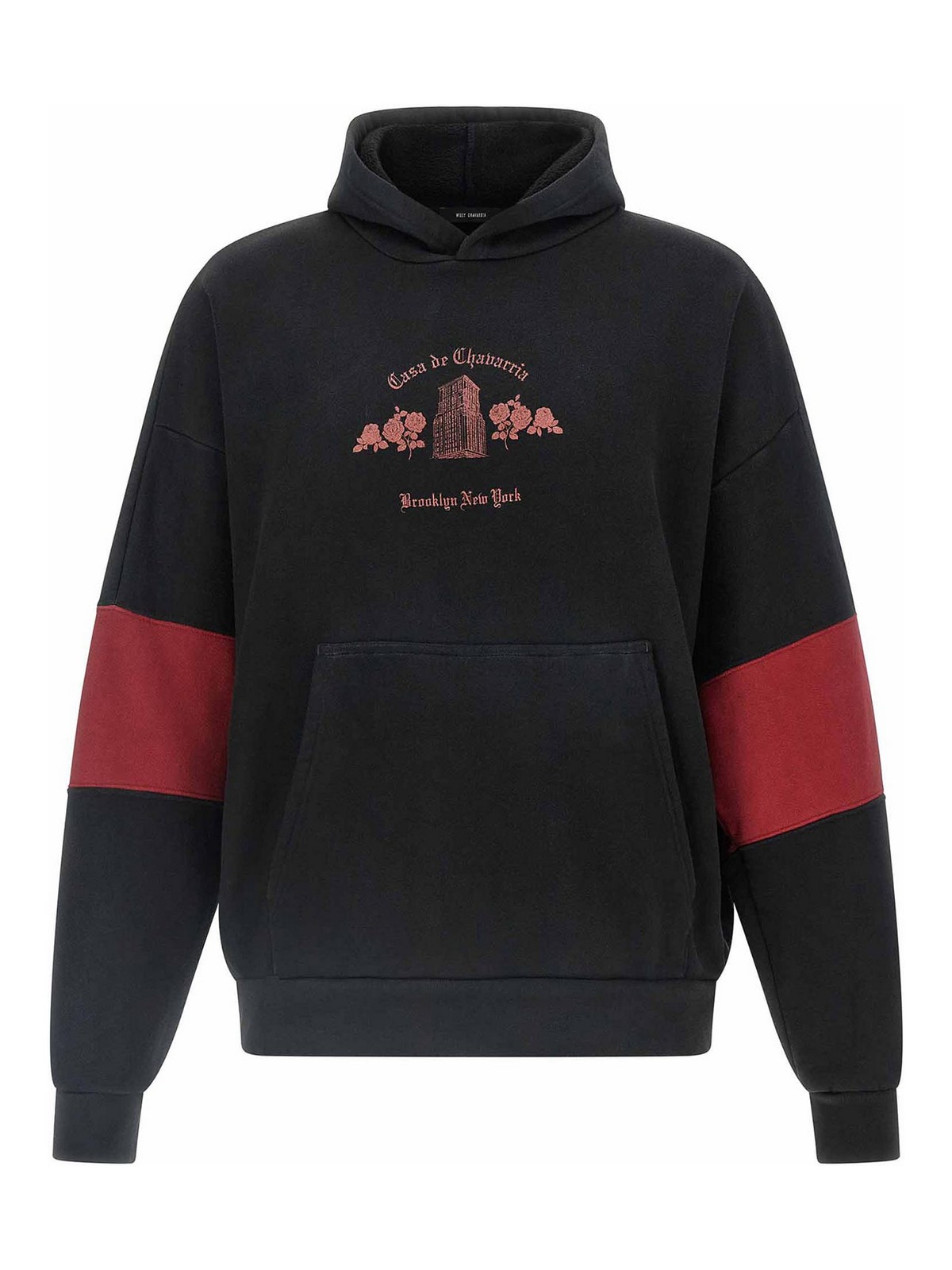 Fleece cotton hoodie with panel construction with washed effect, front 'casa de chavarria' print, kangaroo pocket, long sleeves with contrast insert, dropped cuffs and shoulders, and asymmetrical hem.