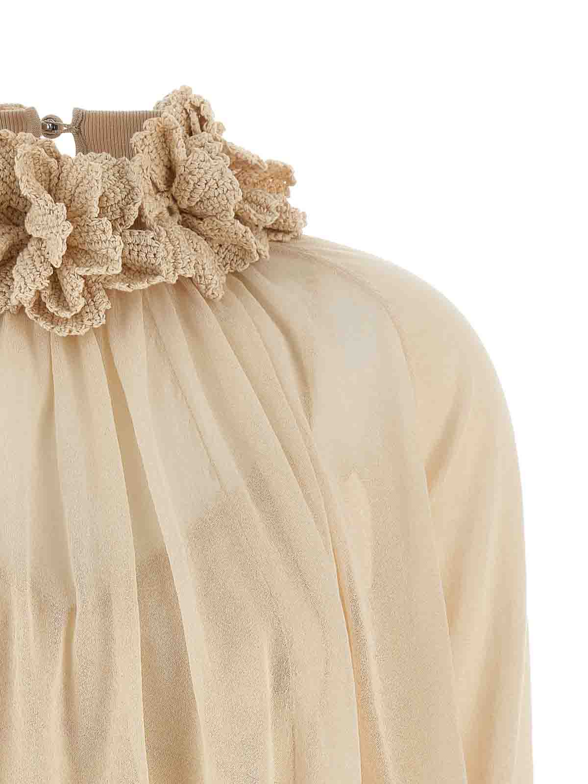 hypnotic crochet trim' semi-transparent cotton knit top, detachable top with thin straps, crew neck with croche detail and curl, long sleeves with curled cuffs.