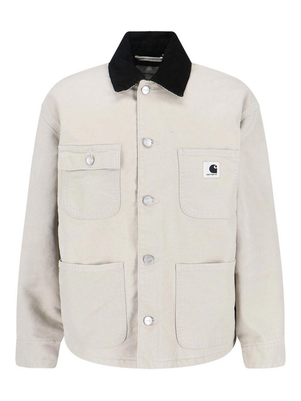 og michigan carhartt wip jacket, in gray organic cotton, light shade, contrasting velvet collar, button closure, one front button pocket, front logo patch, two side pockets, buttoned cuffs, one internal flat pocket, straight hem.