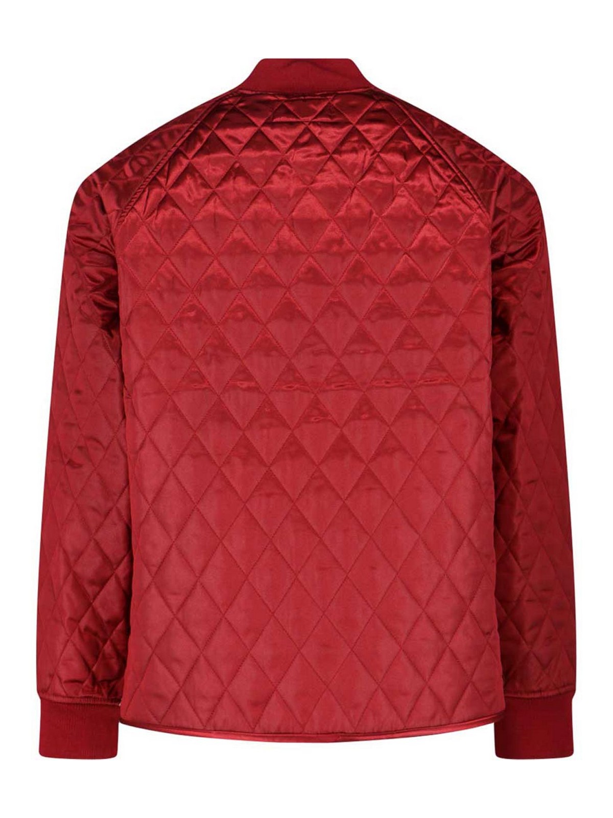 Carhartt wip alumni liner jacket, in red fabric, padded and quilted design, shawl collar, ribbed finishes, button closure, contrasting chest logo patch, two side patch pockets, elasticated cuffs, straight hem.