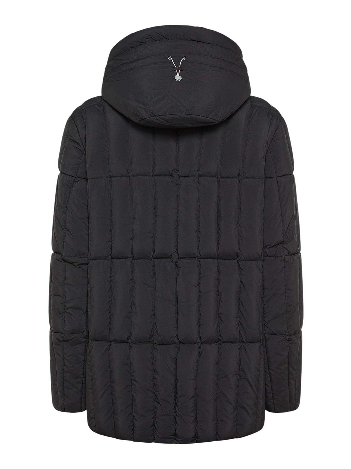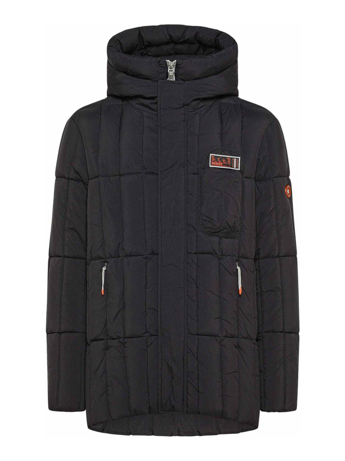 Dekker pier down jacket with internal bib and double hood / black short down jacket with a technical and urban character, made of super-light 20 denier nylon with a semi-matte finish and weighing just 40 grams. the small bullion quilting and the clean design are inspired by the functional aesthetics of military naval clothing. the water repellent fabric and synthetic sorona padding ensure warmth, comfort and protection against cold and light rain. the fixed internal bib and double hood offer further insulation and defense from the elements, while the technical details, full front zip, invisible side pockets and crater collar enhance the precision of the design. The garment is completed by the chest pocket with magnetic button, the iconic metal porthole on the sleeve and the orange logo ribbon on the back of the hood, distinctive symbols of the Dekker DNA. a versatile and high-performance down jacket, perfect for the city and for more dynamic days. fit: regular length: medium main fabric: 100% polyamide padding: 100% sorona polyester details: fixed internal bib, double hood, invisible pockets, chest pocket with magnetic button crater collar properties: water repellent mood: informal