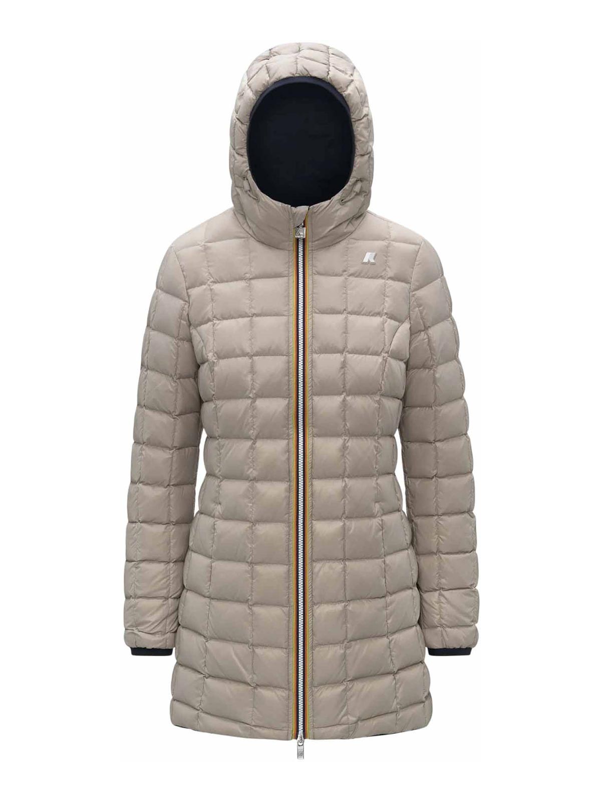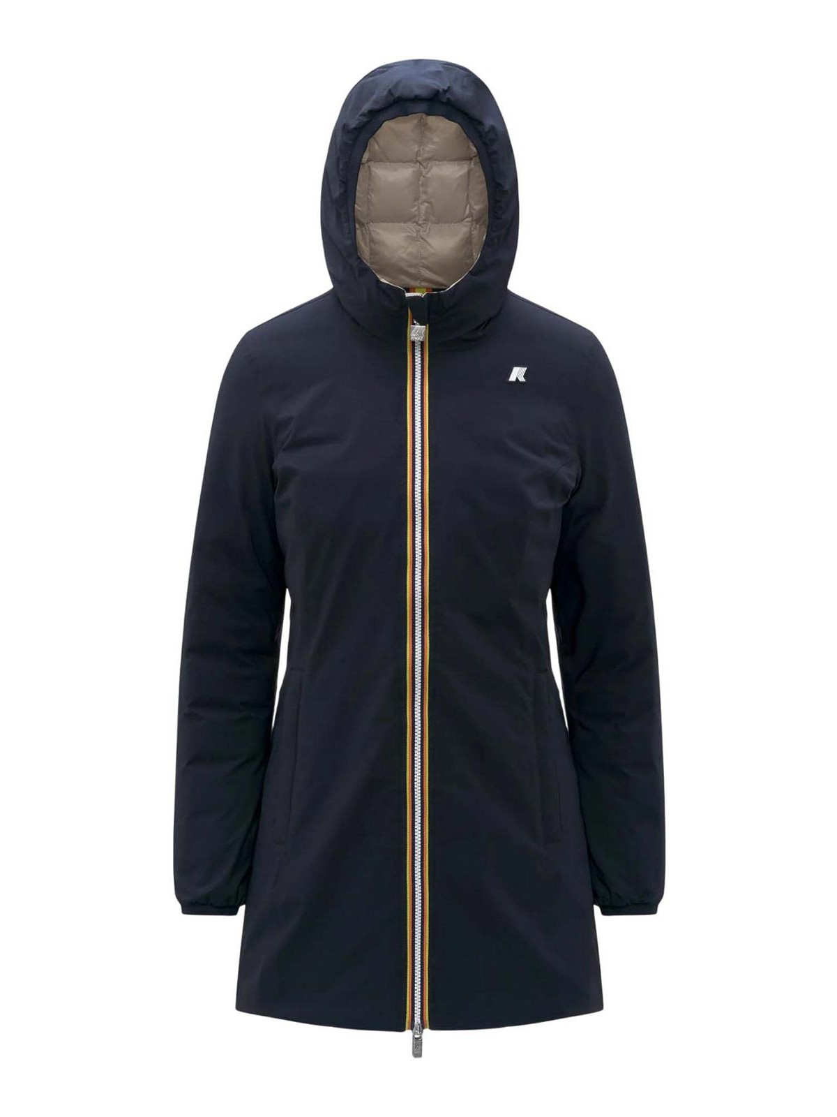 K-way women's down jacket denise st thermo reversible blue-beige / slim fit women's long down jacket denise st thermo reversible, designed to offer maximum protection from the cold with an elegant and versatile design. the model has a reversible construction, with one side in smooth, waterproof and breathable technical fabric and the other in quilted nylon in a contrasting colour. The natural down padding guarantees high thermal insulation while maintaining lightness and comfort. the adjustable hood, functional pockets, double-slider front zip and heat-taped seams ensure practicality and protection in all weather conditions. eco fabric in stretch polyester, waterproof, water-repellent, windproof and breathable, inner side in quilted nylon with down retention, natural down padding, high level of warmth, reversible design, heat-taped seams, adjustable hood with elastic cord, zip closure, elasticated cuffs, two pockets with zip and two with snap buttons, slim fit colour: blue depth beige cashmere k-way logo in white silicone product care: delicate wash max 30c do not bleach do not tumble dry do not iron do not dry clean wash separately protect accessories when washing composition: exterior: 76% recycled polyester, 24% polyurethane lining: 100% recycled nylon padding: 90% duck down, 10% duck feather