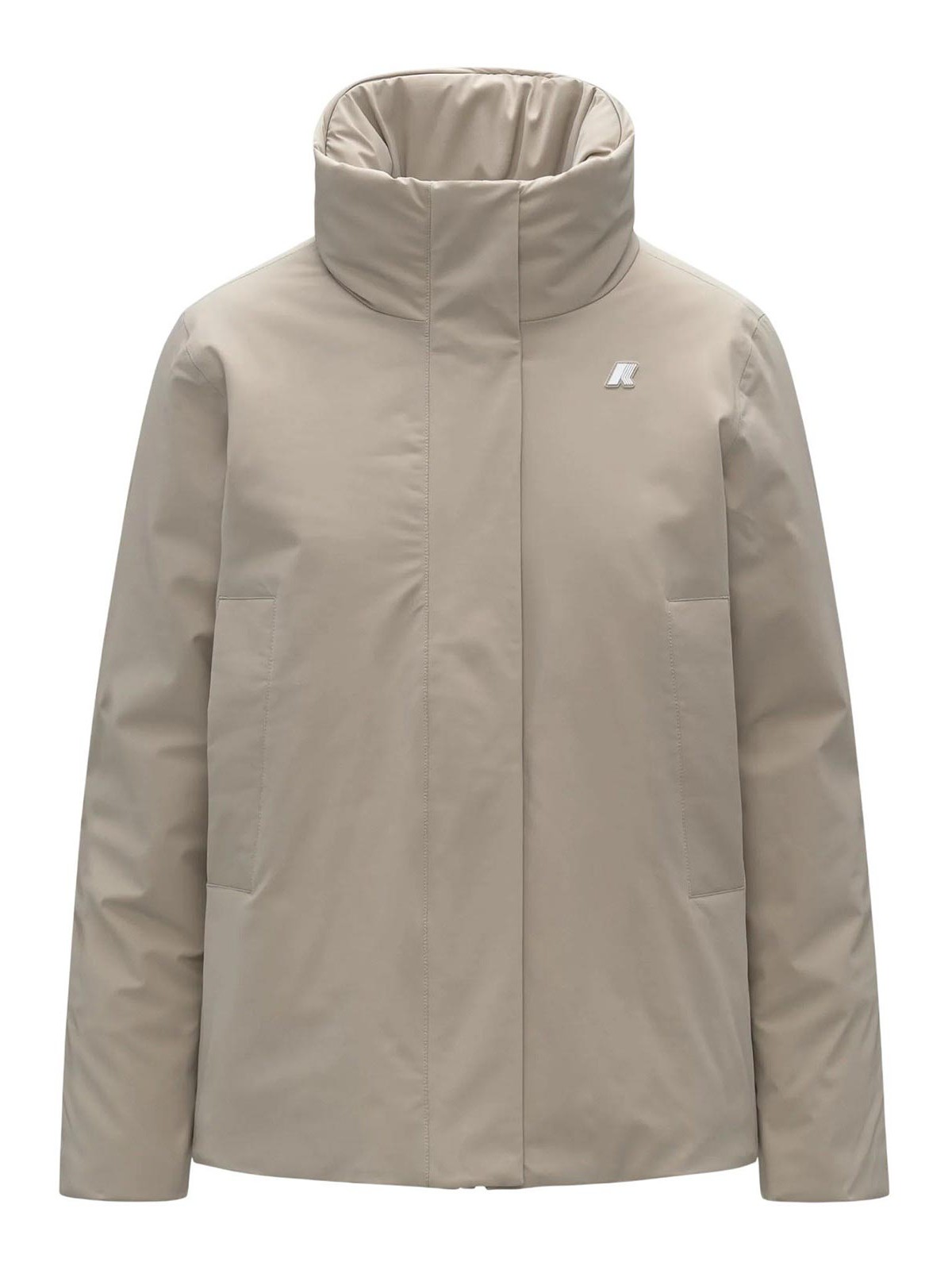 K-way marlette st warm women's jacket in beige waterproof fabric / regular fit short k-way women's jacket with an elegant and functional design, ideal for the city and perfect for mid-season. the marlette model reinterprets the classic urban outerwear in a feminine and refined way, thanks to the possibility of modulating the side openings with hidden snap buttons, which allow you to vary the fit from more linear to slightly flared. made of waterproof and windproof fabric, equipped with light synthetic fiber padding which guarantees a medium degree of warmth, suitable for autumn and early winter. the hood integrated into the high collar, removable in case of rain, adds versatility and practicality. The garment is completed by a double-slider zip closure covered by a flap, cuffs with internal gaiter, two pockets with snap closure and the white silicone K-way logo. waterproof and windproof technical fabric internal lining in shiny fabric light wadding padding medium heat level hood integrated in the collar, removable double slider zip with zip cover flap cuffs with internal gaiter two side pockets with snap closure adjustable side openings with invisible buttons regular fit heat-taped seams colour: cashmere beige product care: delicate wash max 30c do not bleach do not tumble dry iron at low temperature do not dry clean wash separately protect accessories when washing composition: exterior: 92% nylon, 8% elastane lining: 100% recycled nylon padding: 100% polyester