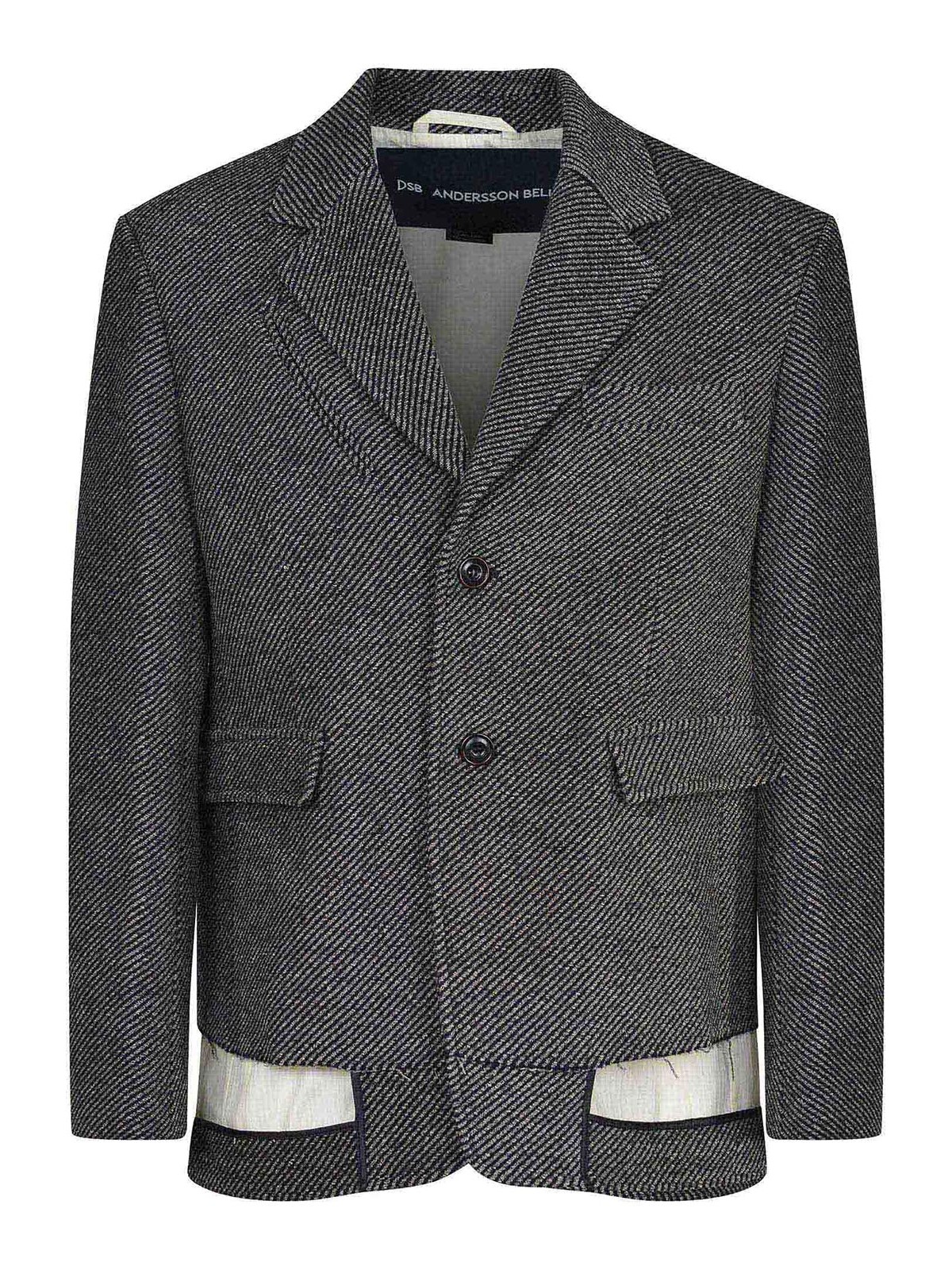 Andersson bell jacket made of wool blend in gray color. thin stripe pattern. classic lapel. single-breasted. two-button closure. long sleeves. buttoned cuffs. side flap pockets. raw-cut detail at the hem with sheerness. 69% cotton, 31% wool