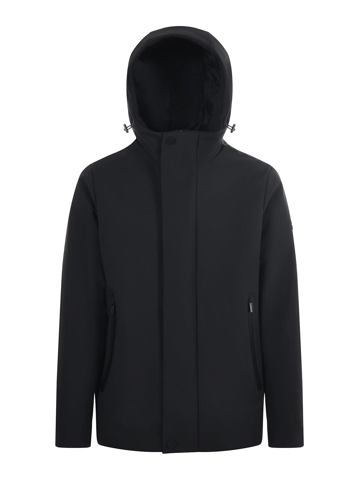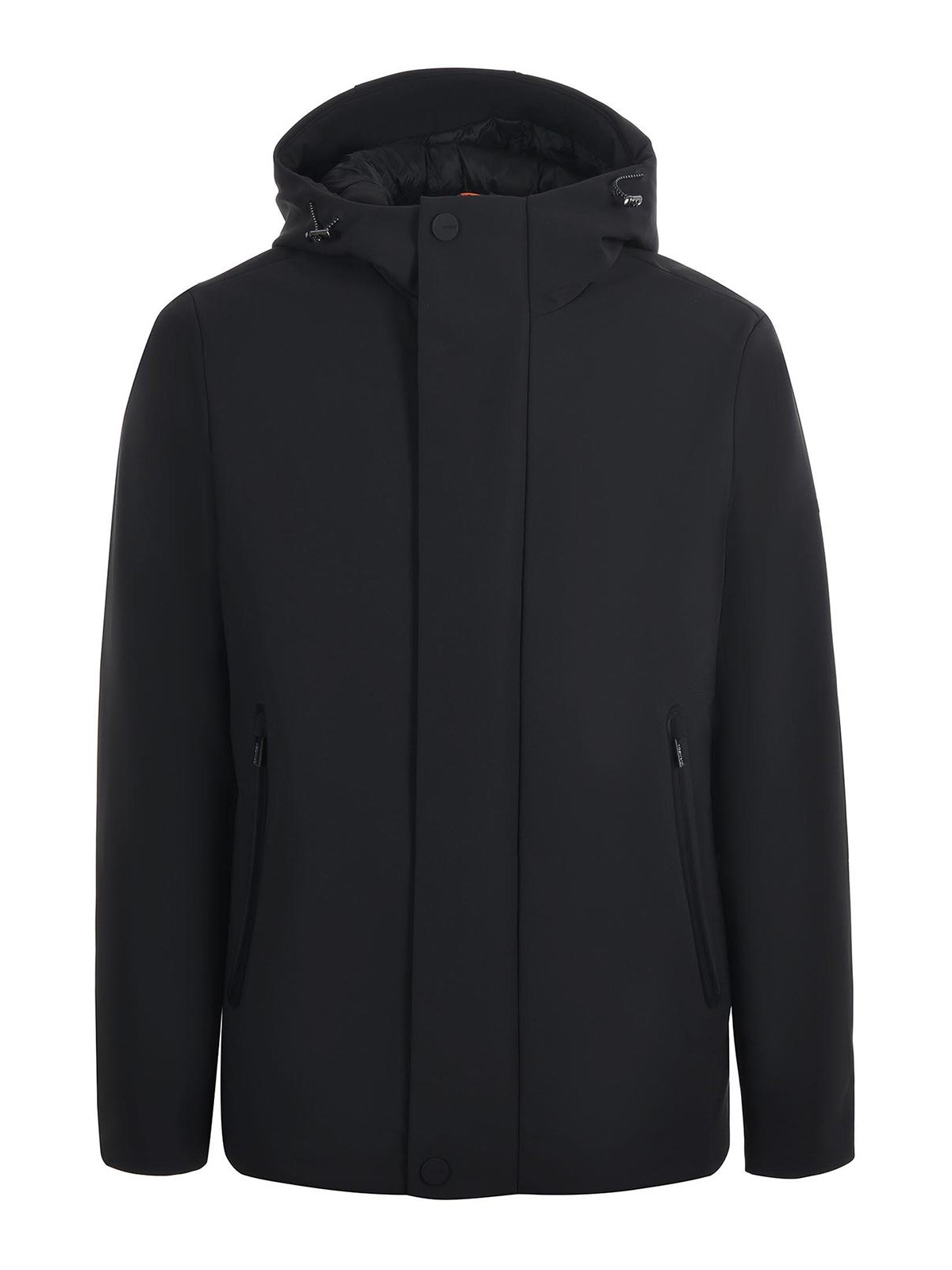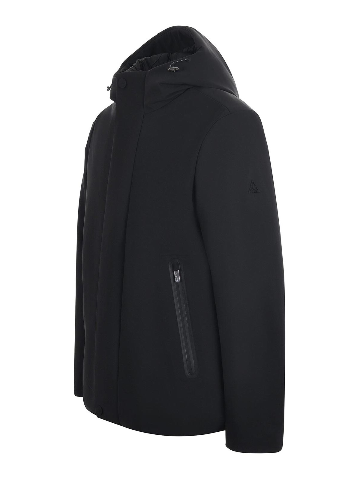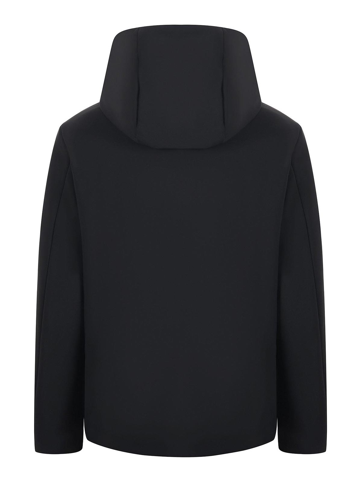 Black technical fabric heskimo jacket. lightly padded. drawstring hood. zip pockets. double-slider zip closure. rubberized logo on the left sleeve. size shown: 50 95% polyester, 5% elastane 100% polyester padding: 100% polyester