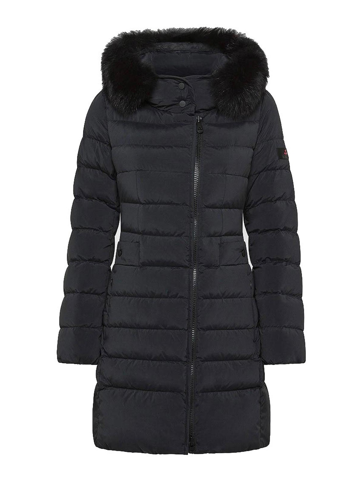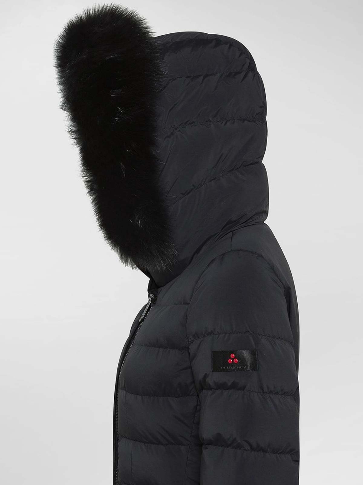 Peuterey long quilted down jacket in lightweight nylon poplin and polyester microfibre, natural down padding, with a central double-slider zip, wraparound collar with tone-on-tone press studs and hood with fox fur trim, removable, side pockets with press