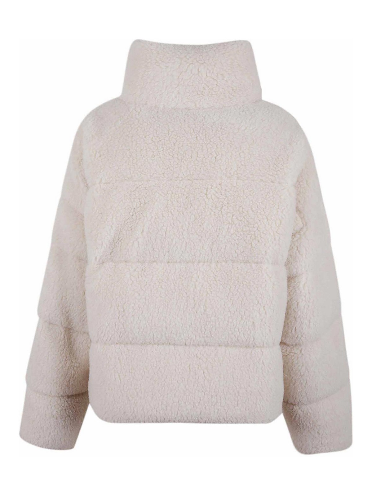 Jacket in butter-colored teddy bear fabric, down padding, standing collar, faux fastening with zip and snap buttons, flap pockets, details and nylon lining.
