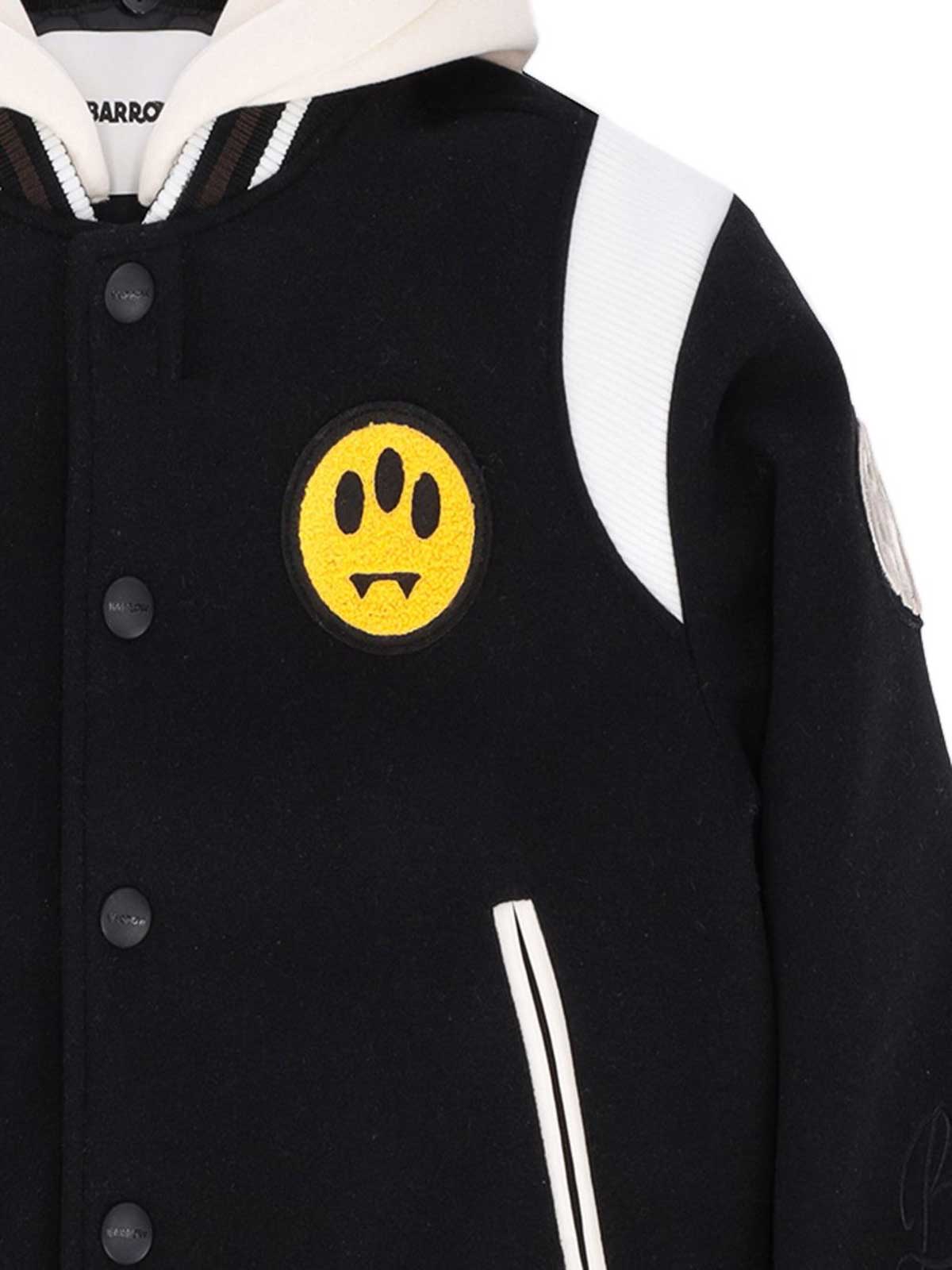 Hooded jacket features black hood varsity sleeves logo embroidered buttons