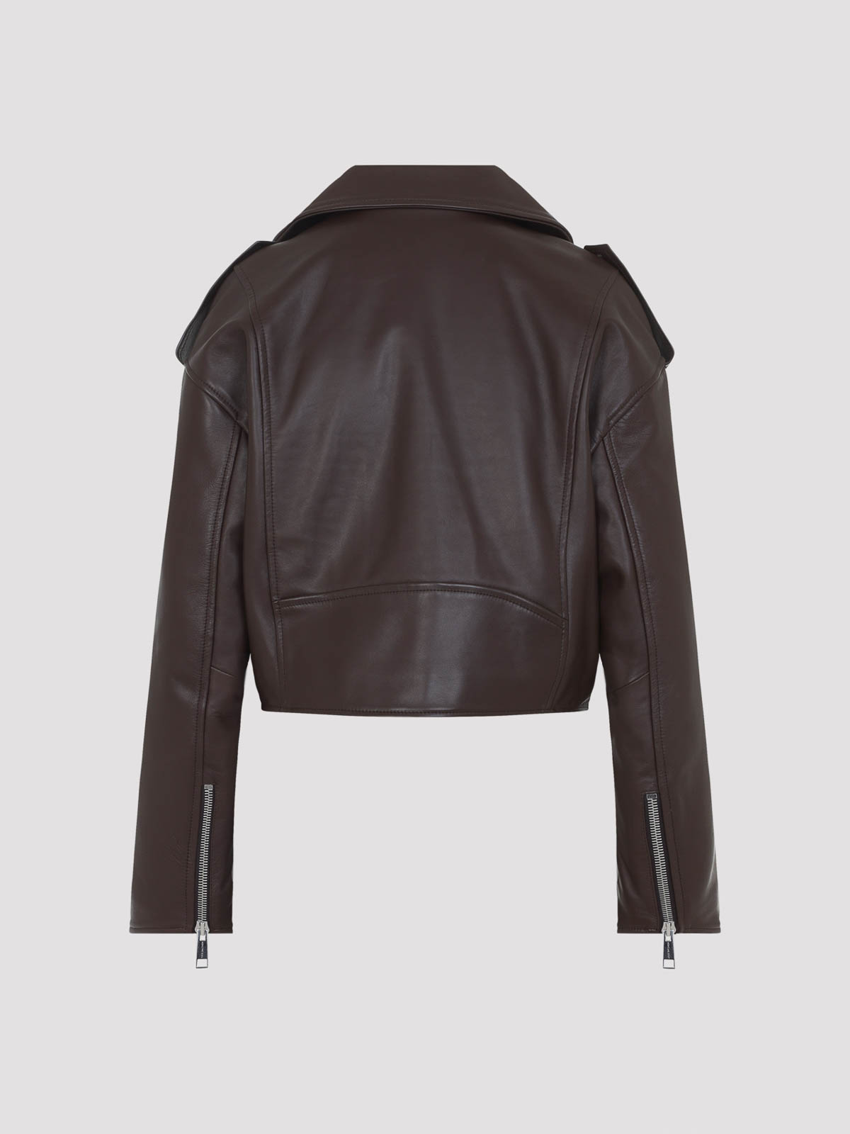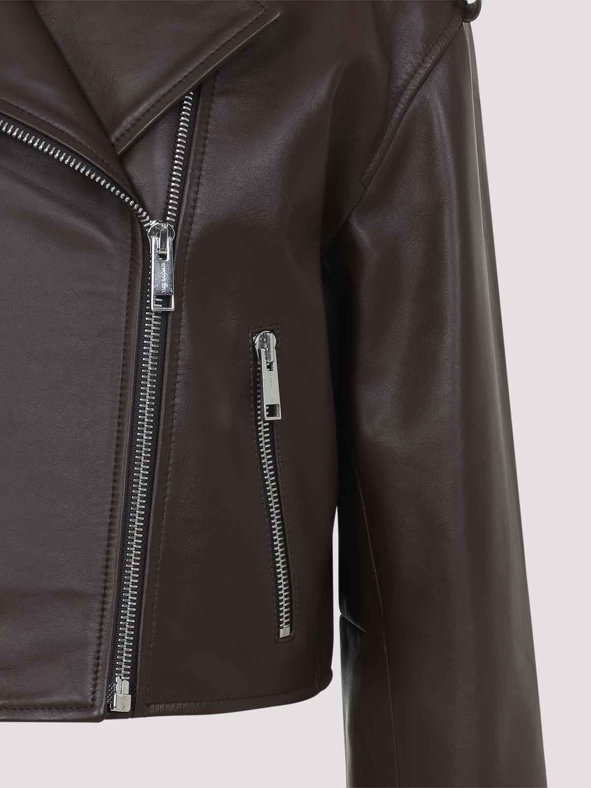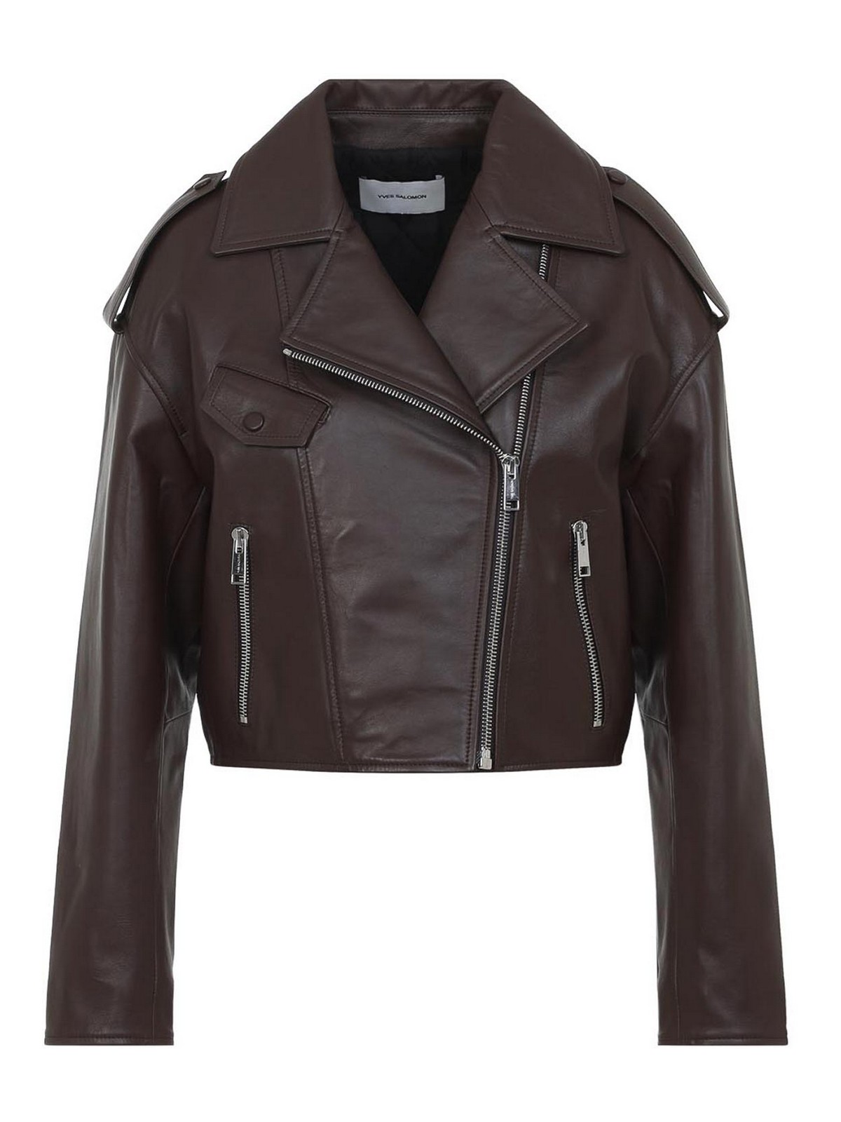 Yveas salomon chia brown lamb leather jacket. crafted in lamb leather, polyester and silk. chia brown lamb leather jacket, notched collar, front zipped fastening, side zipped pockets, tonal leather buttoned straps on the shoulders, long sleeves, cropped biker design, straight hem, fully lining.