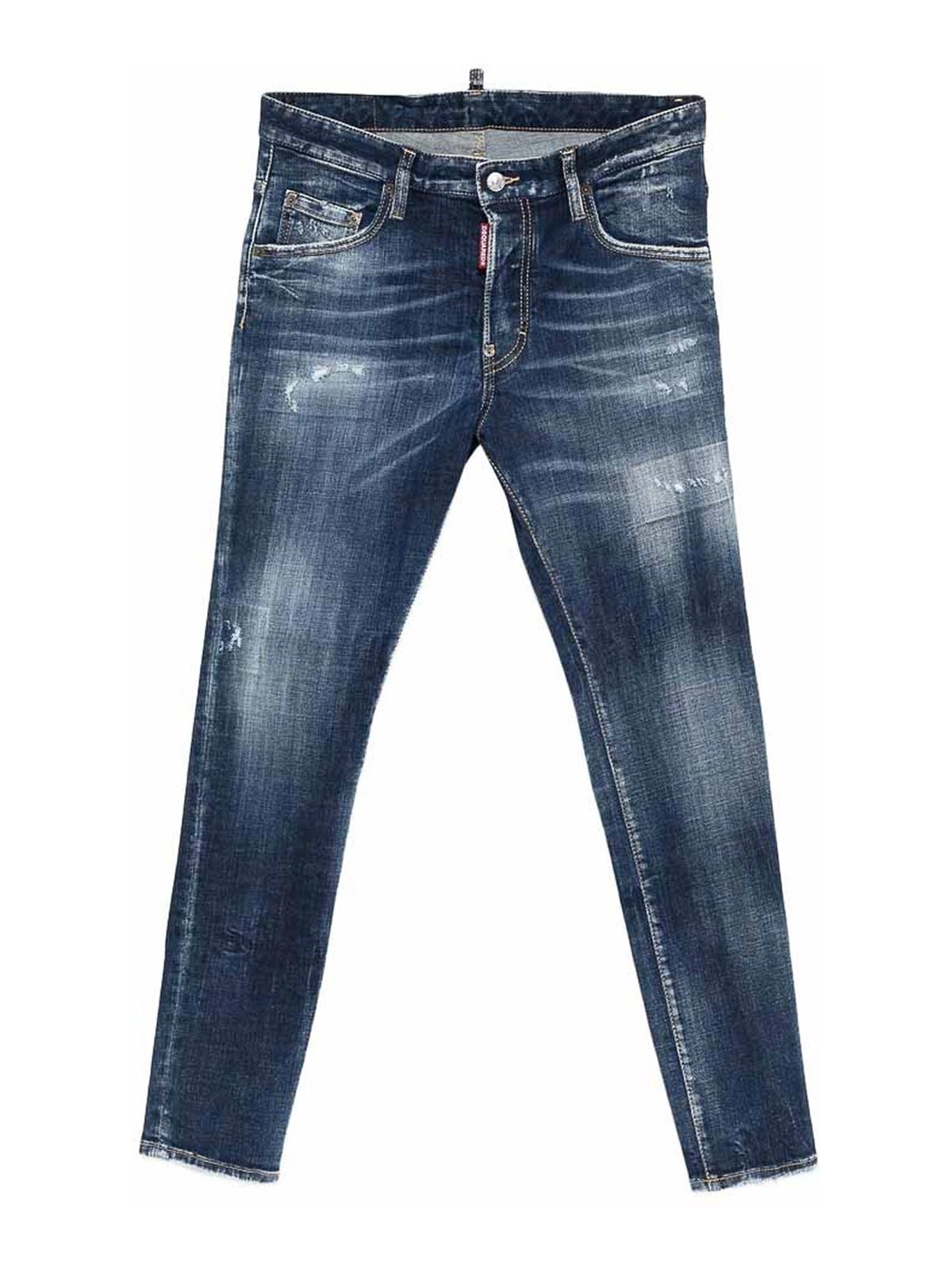 Navy blue faded distressed detailing five-pocket styling button fly belt loops