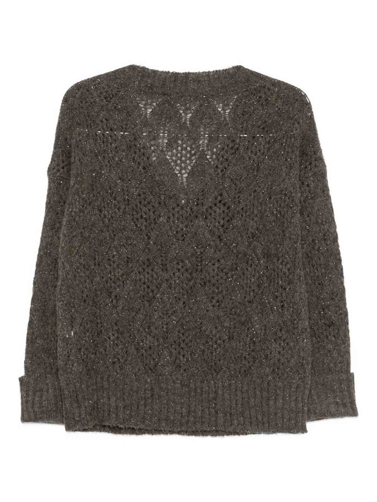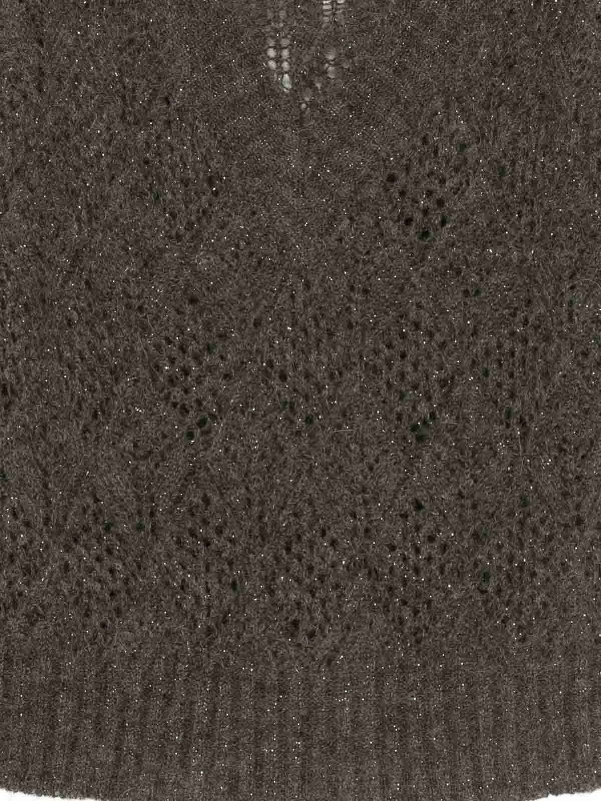 Brown openwork knit v-neck long sleeves turn-up cuffs