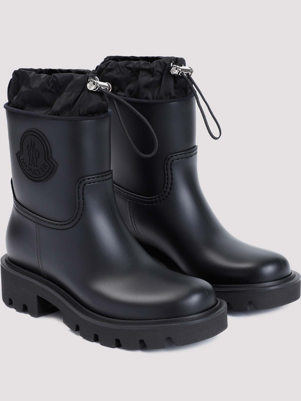 Moncler kickstream black pvc boots. crafted from black pvc, ankle-length, waterproof, round toe, side tonal logo patch, loop at the back, nylon at the edge with drawstring, branded fabric insole, rubber outsole.
