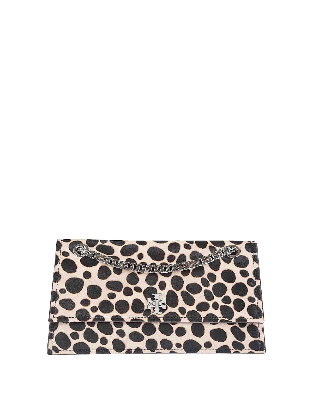 Animal print pony skin bag, flap and twist lock button closure, Tory Burch logo, chain shoulder strap, silver tone metal parts, two internal compartments, one internal pocket, case with logo.