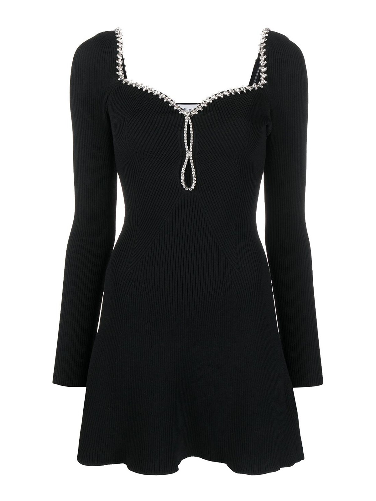 Black diamante knit minidress from self-portrait stretch knit ribbed finish sweetheart neck diamante trim long sleeves keyhole cut-out at chest and flared hem