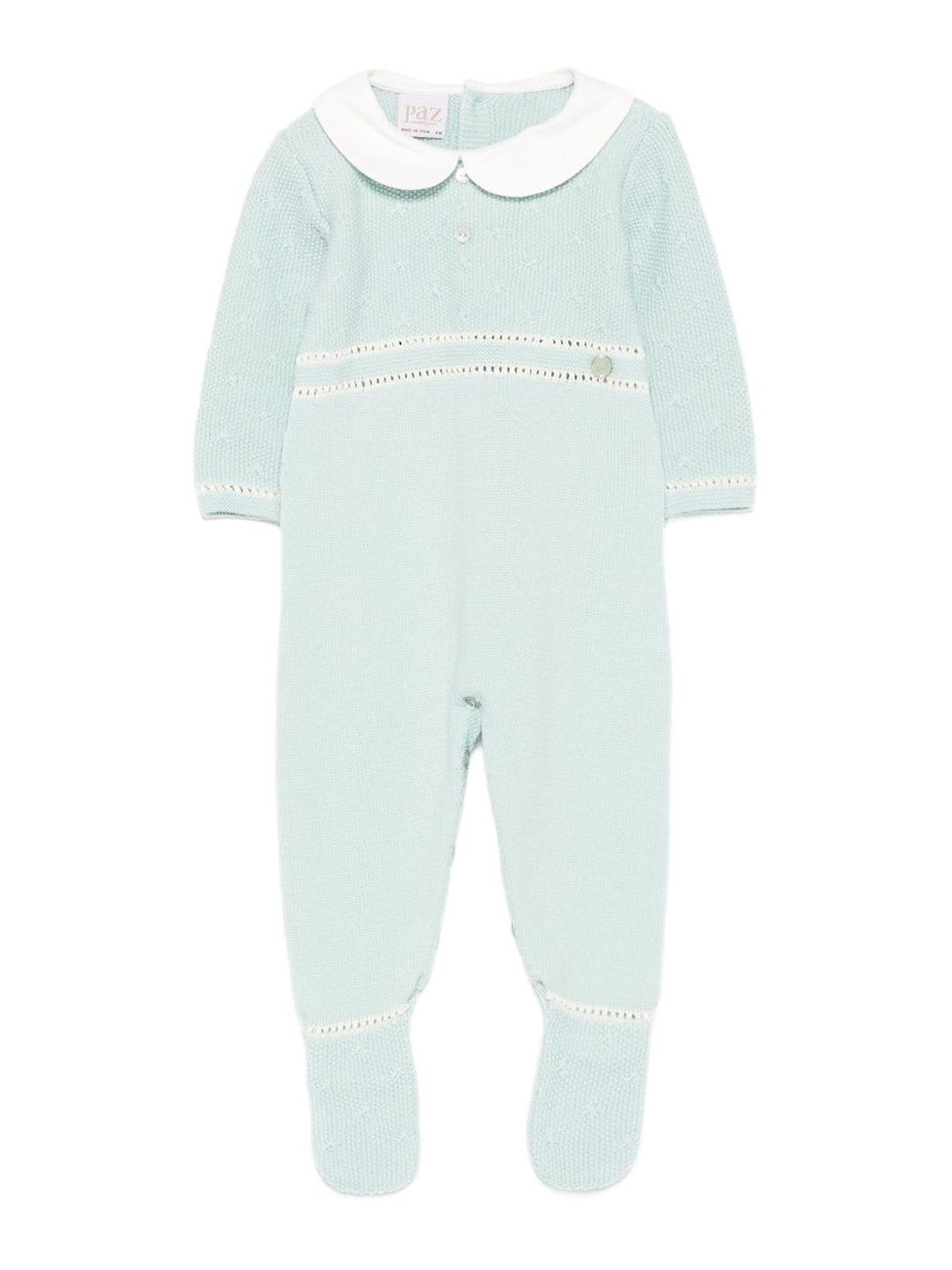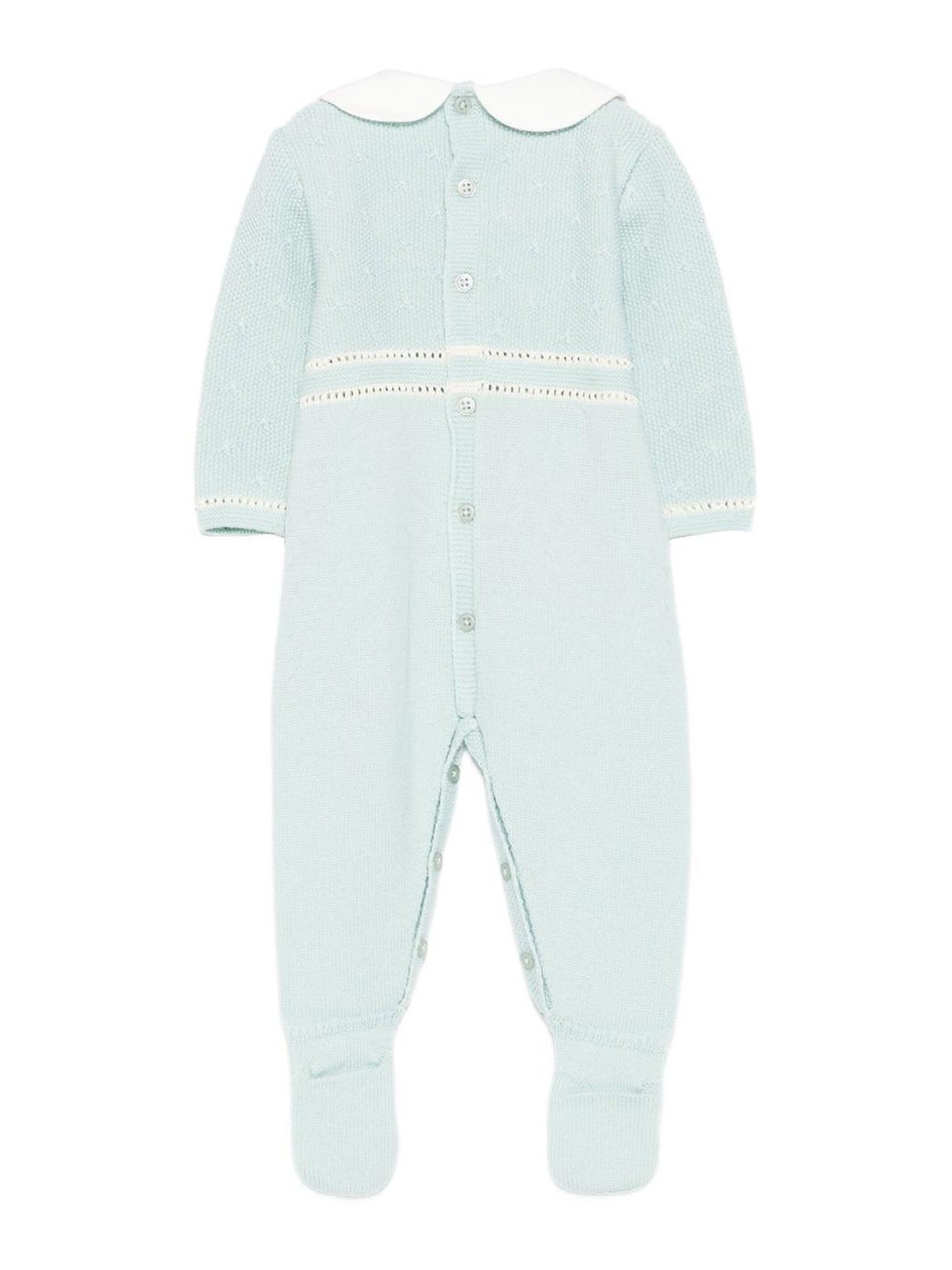 Knitted onesie features light green knit peter pan collar at back with decorative button