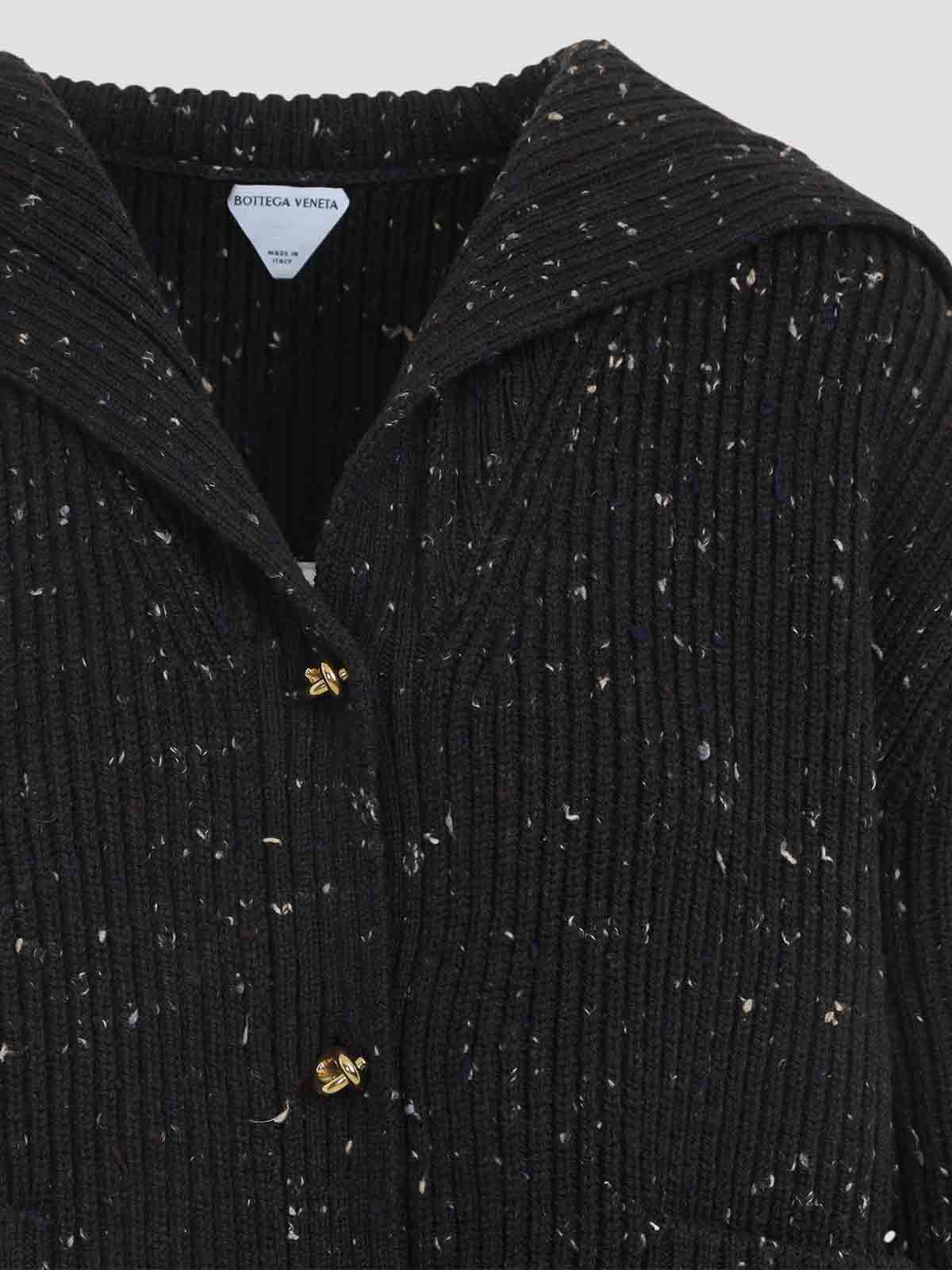 Bottega veneta knot brown cardigan crafted from ribbed brown boucle oversize collar, toned knot button two patch pockets long sleeves straight hem unlined