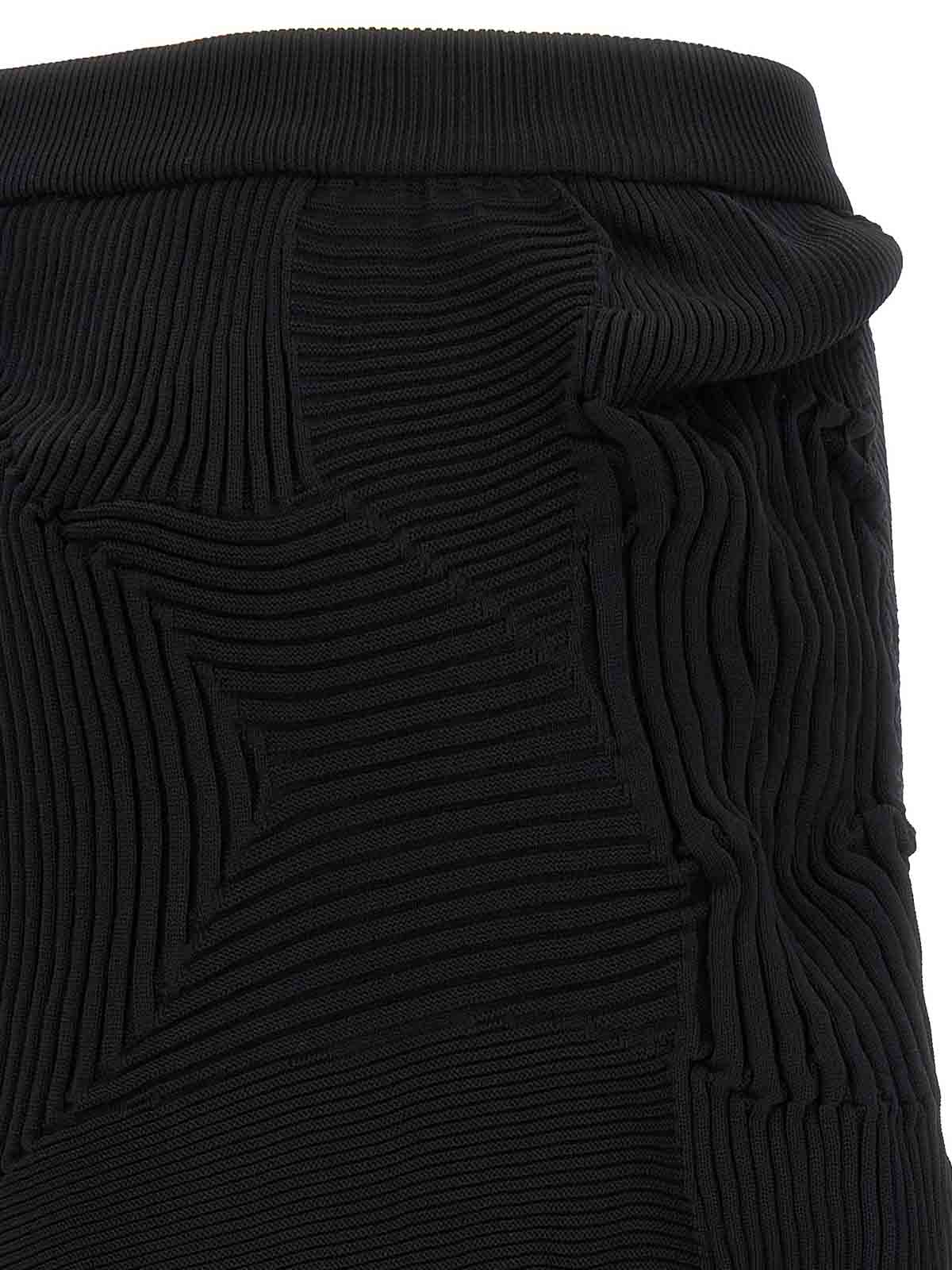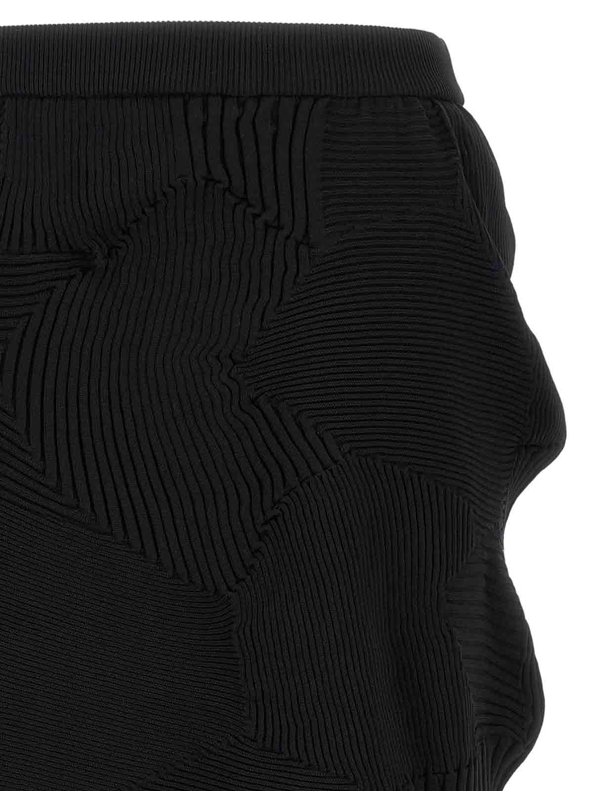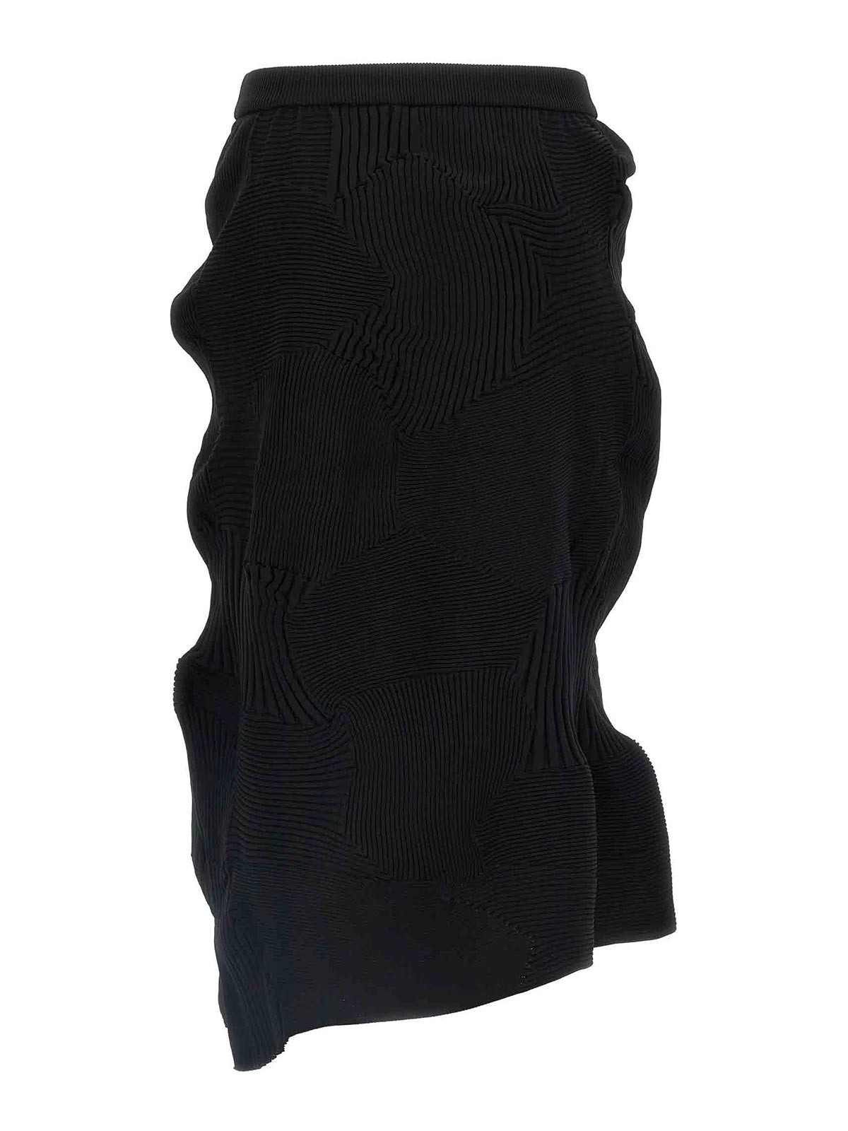 Kone kone' midi skirt in patchwork, seamless pleated fabric with elastic weave structure made with multiple knitted patterns, elastic waistband, side split, and asymmetrical hem.