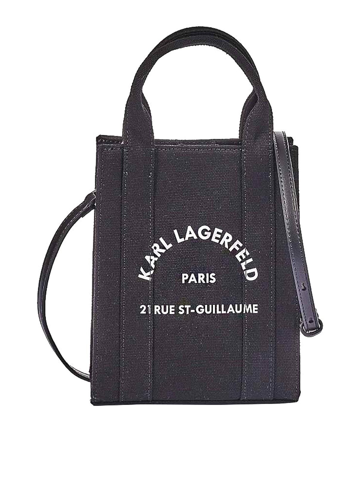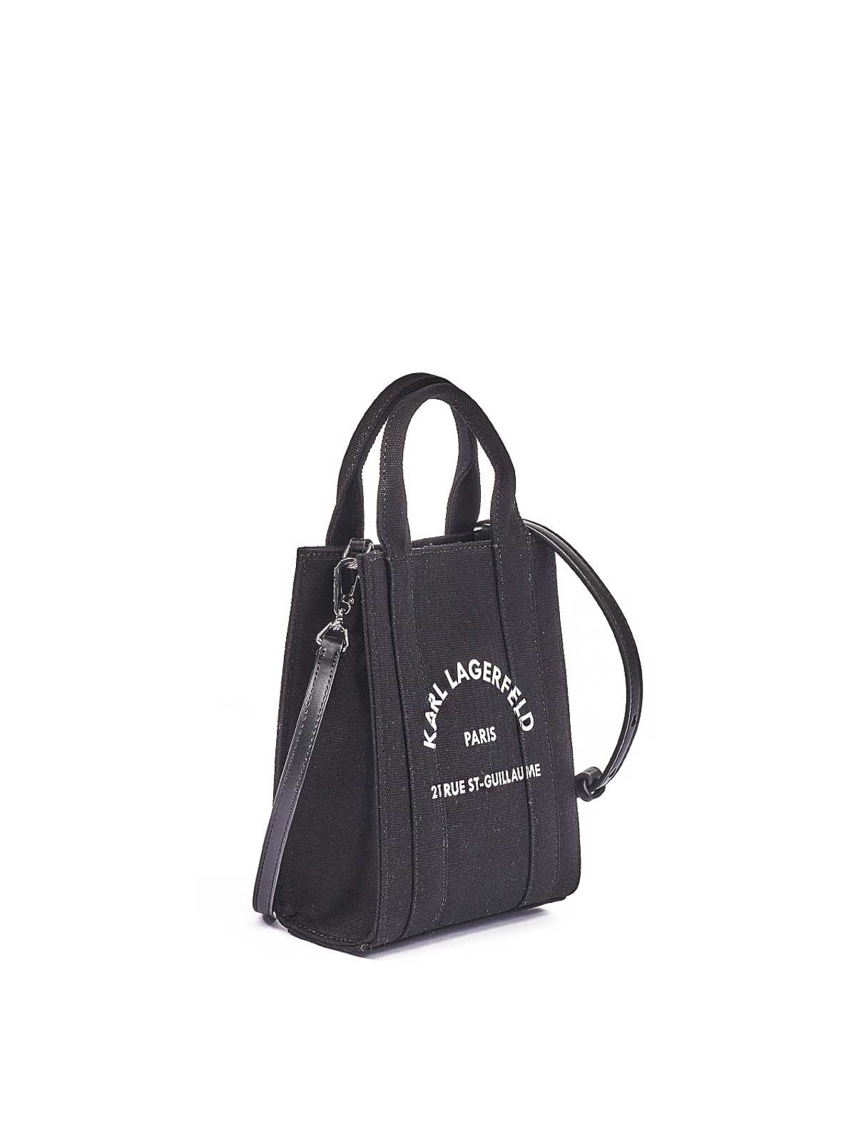 K / RSG Square Small Tote In Black This Tote Bag with printing with Rue st Logo, Guillaume by Karl Lagerfeld characterized by the square silhout and a intertwined texture The bag presents a superior handles with zip and a removable while inside a large unique compartment that makes it perfect as a bag from every day with a squad design rue st, guillaume. removable zip unique compartment h l w