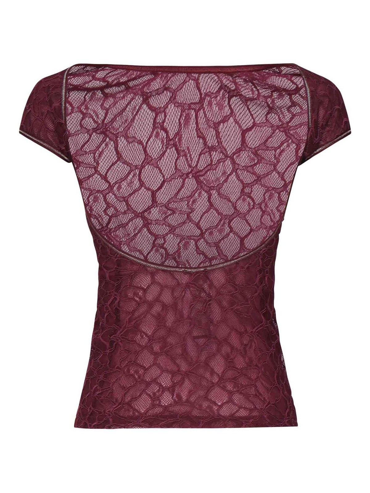 Lace, half sleeves, boat neckline in, wide neckline in back, size shown in photo is s, color bordeaux