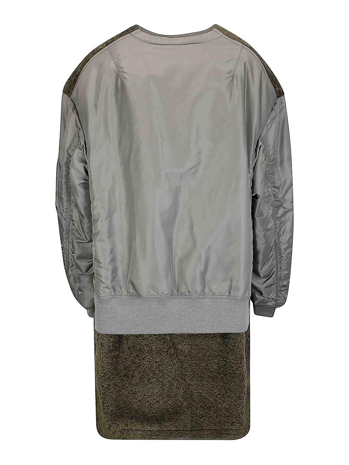Padded jacket with bomber-inspired sleeves, front button closure, flap pockets with snaps, stretch knit details.