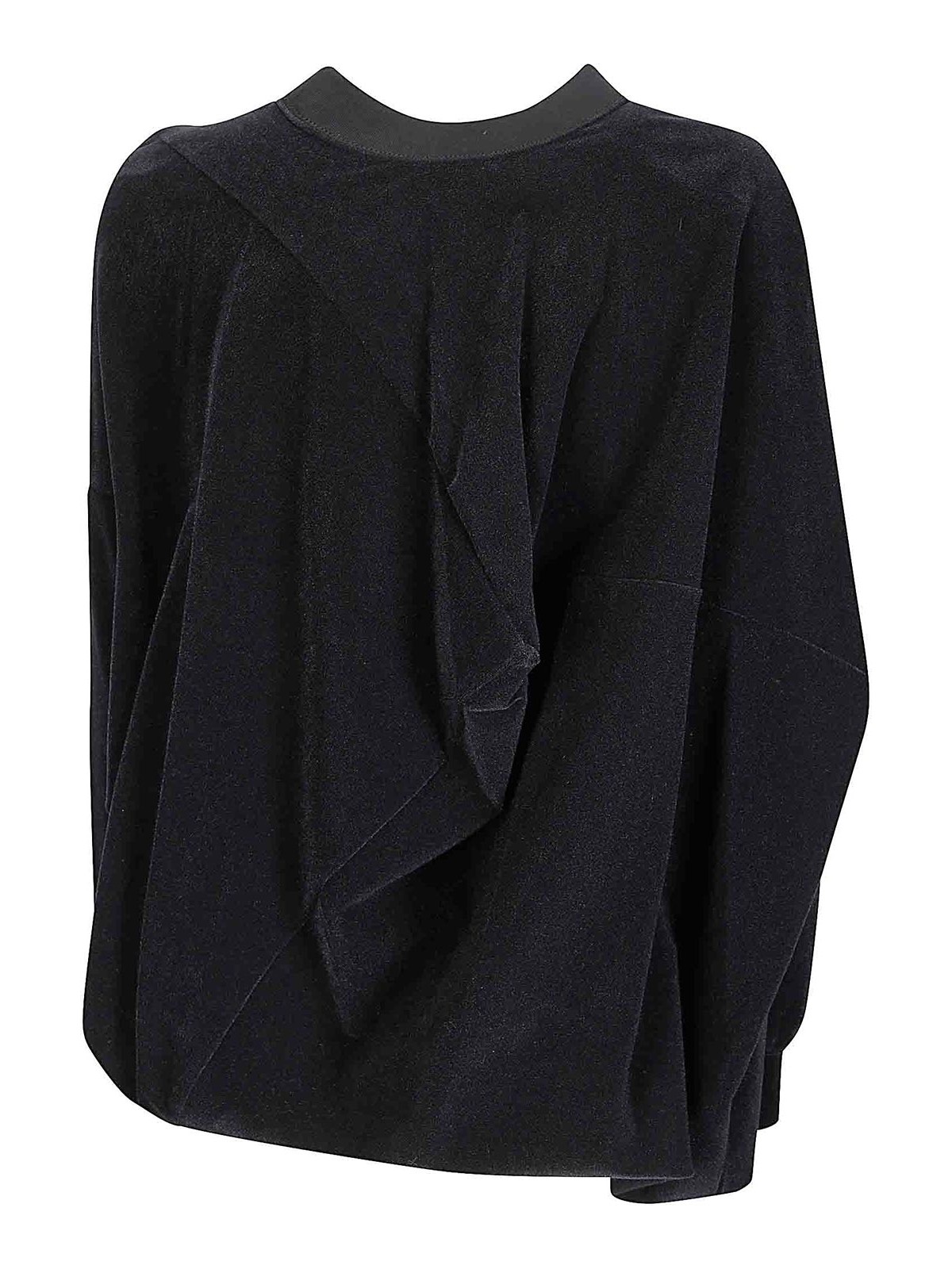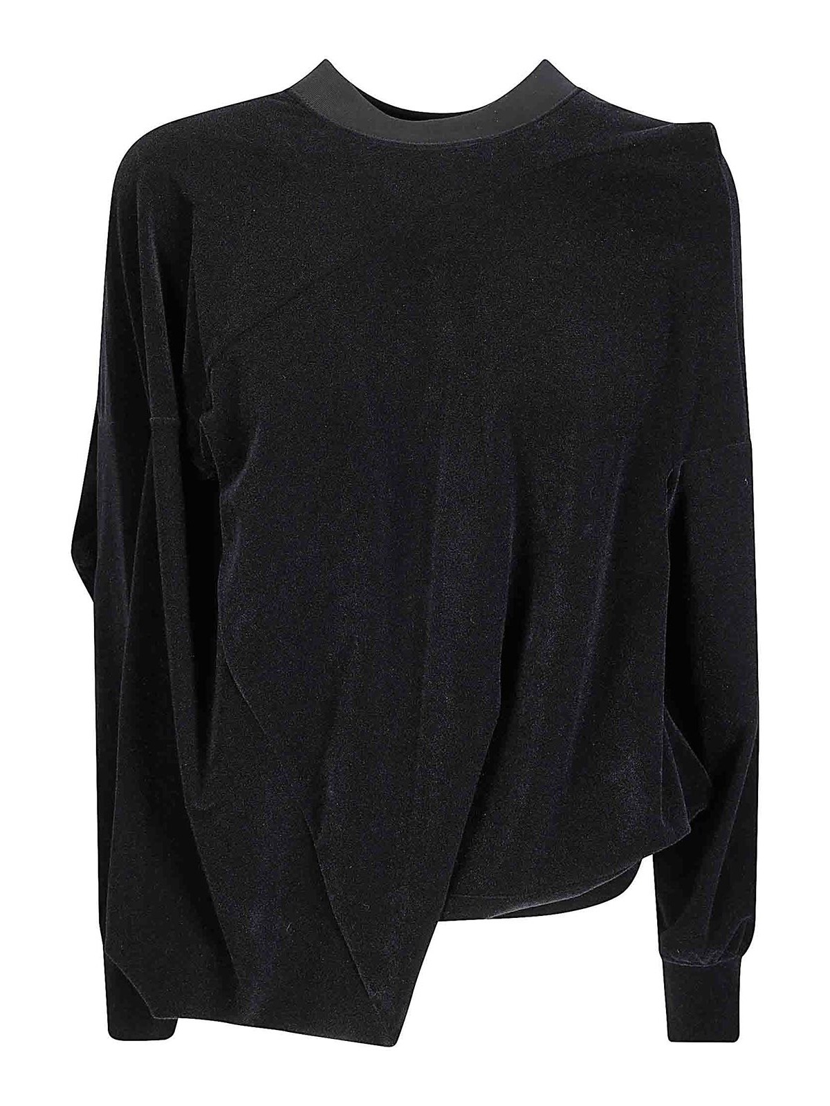 Asymmetric design crew neck sweatshirt with excess fabric, long sleeves, loose fit.
