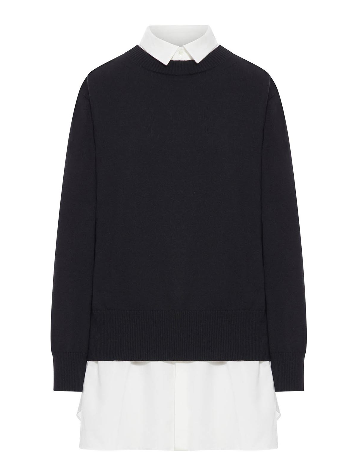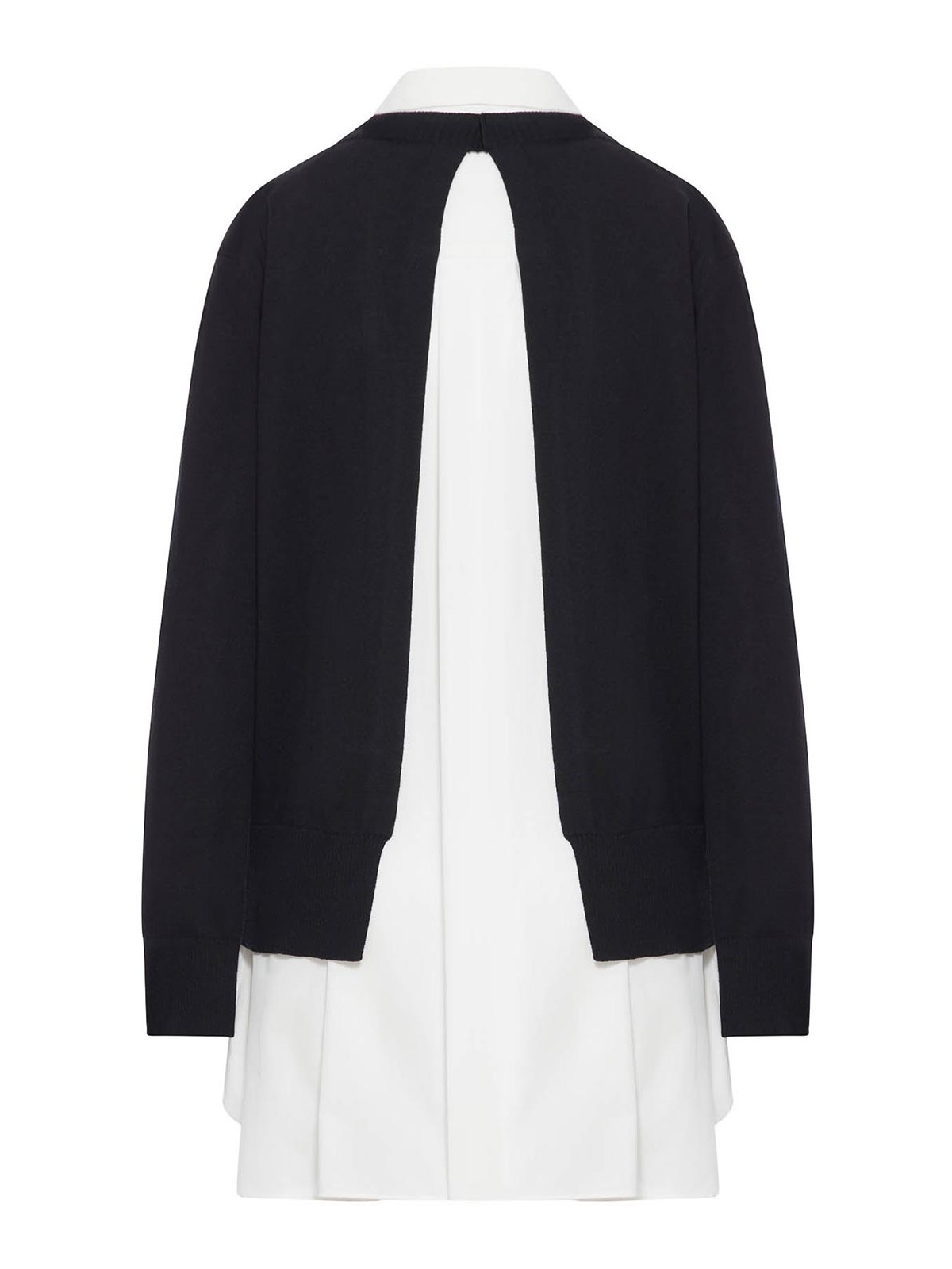 Lower part- classic collar- button placket- back pleatupper part- crew neck- long sleeves- ribbed trim- back slit- white
