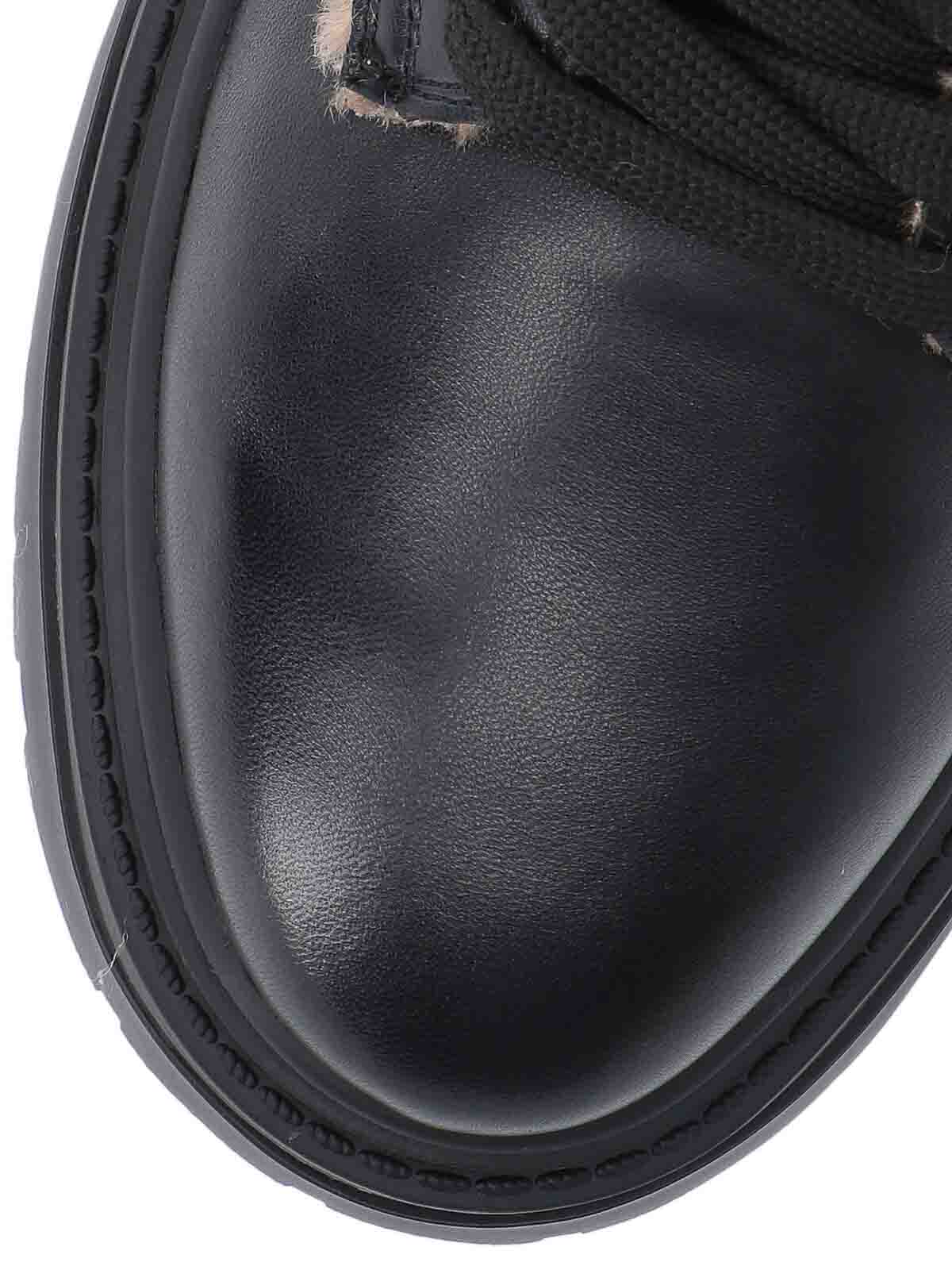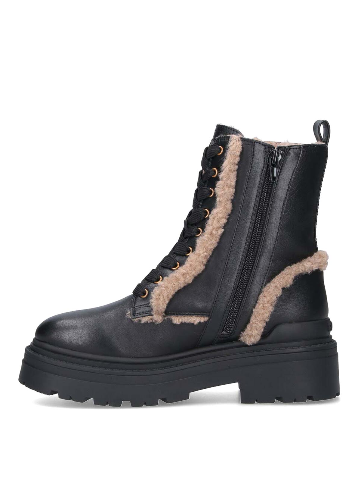 Pinko leather ankle boots, black, beige shearling details, round toe, laces and zip closure, golden logo hardware detail, logo on the back bottom, rubber sole.