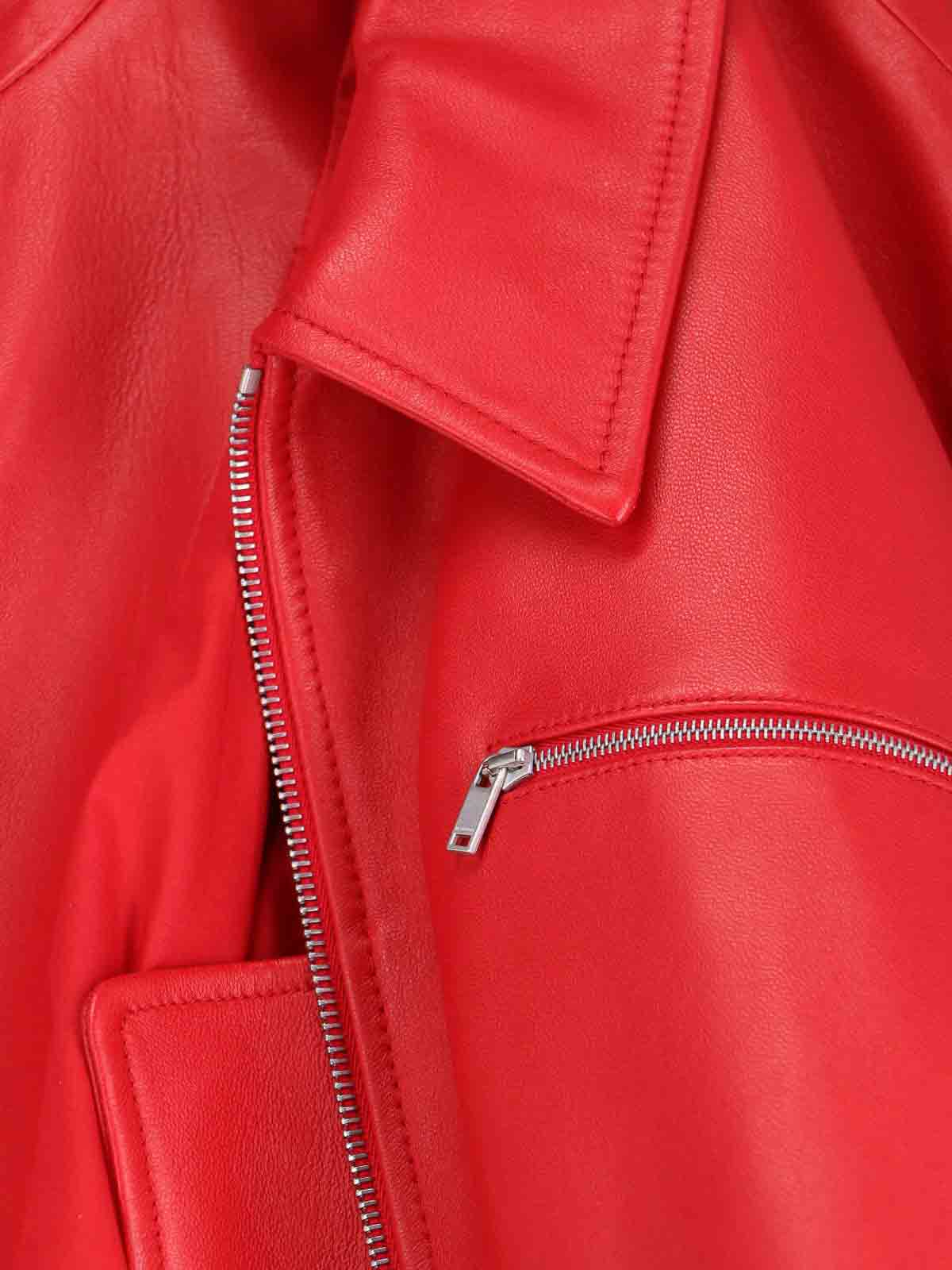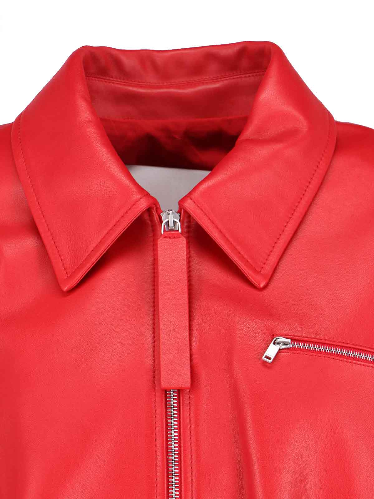 Jil sander leather bomber jacket, red, collar, front zip closure, long sleeves, one front zip pocket, two side pockets, elasticated finishes, straight hem.