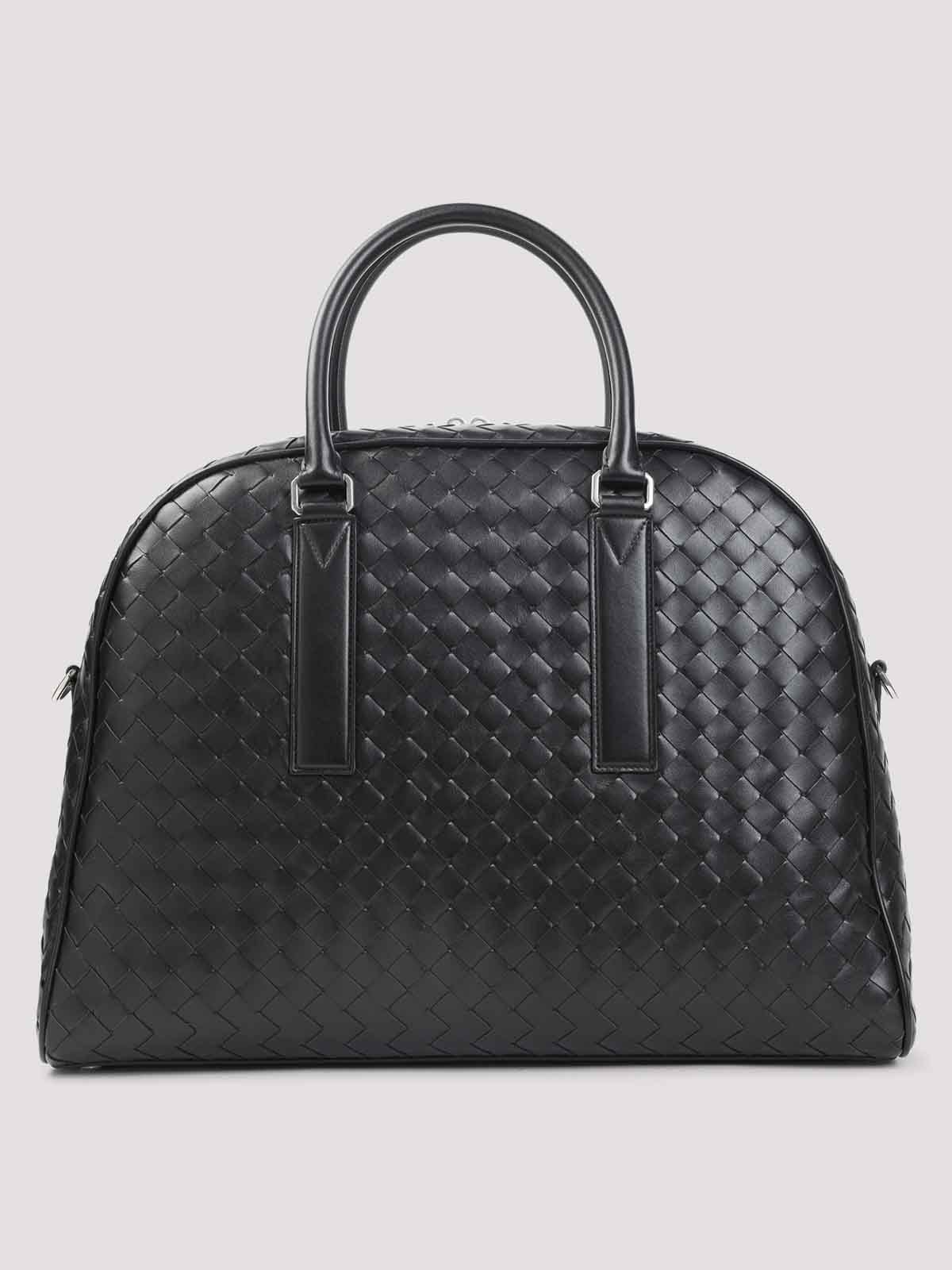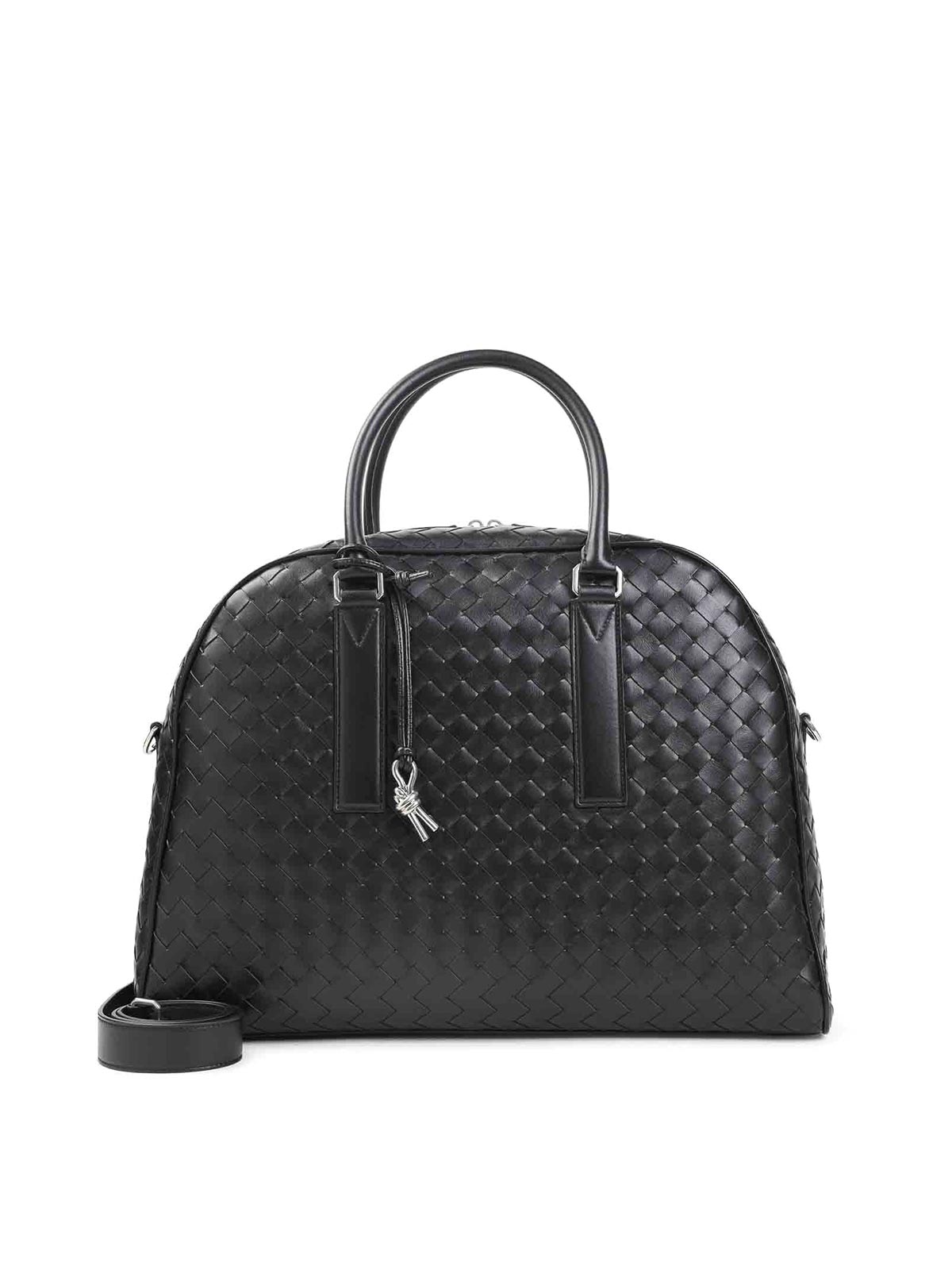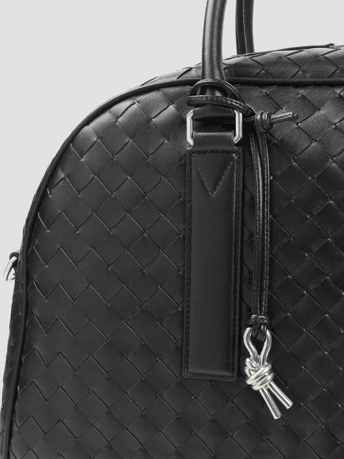 Bottega veneta black handbag crafted from black intrecciato, toned hardware top handles two, way zip on the top detachable keychain with knot attachable and adjustable shoulder strap