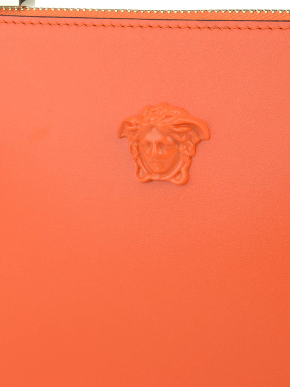 Leather pouch detailed with 3D Medusa logo and wristlet.