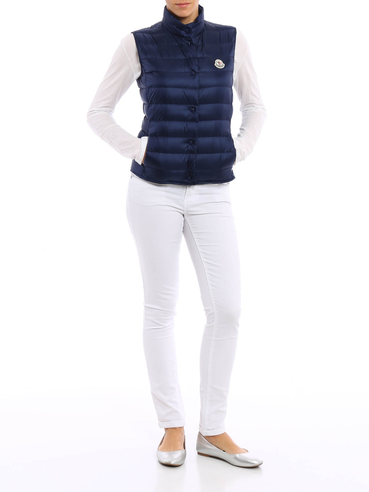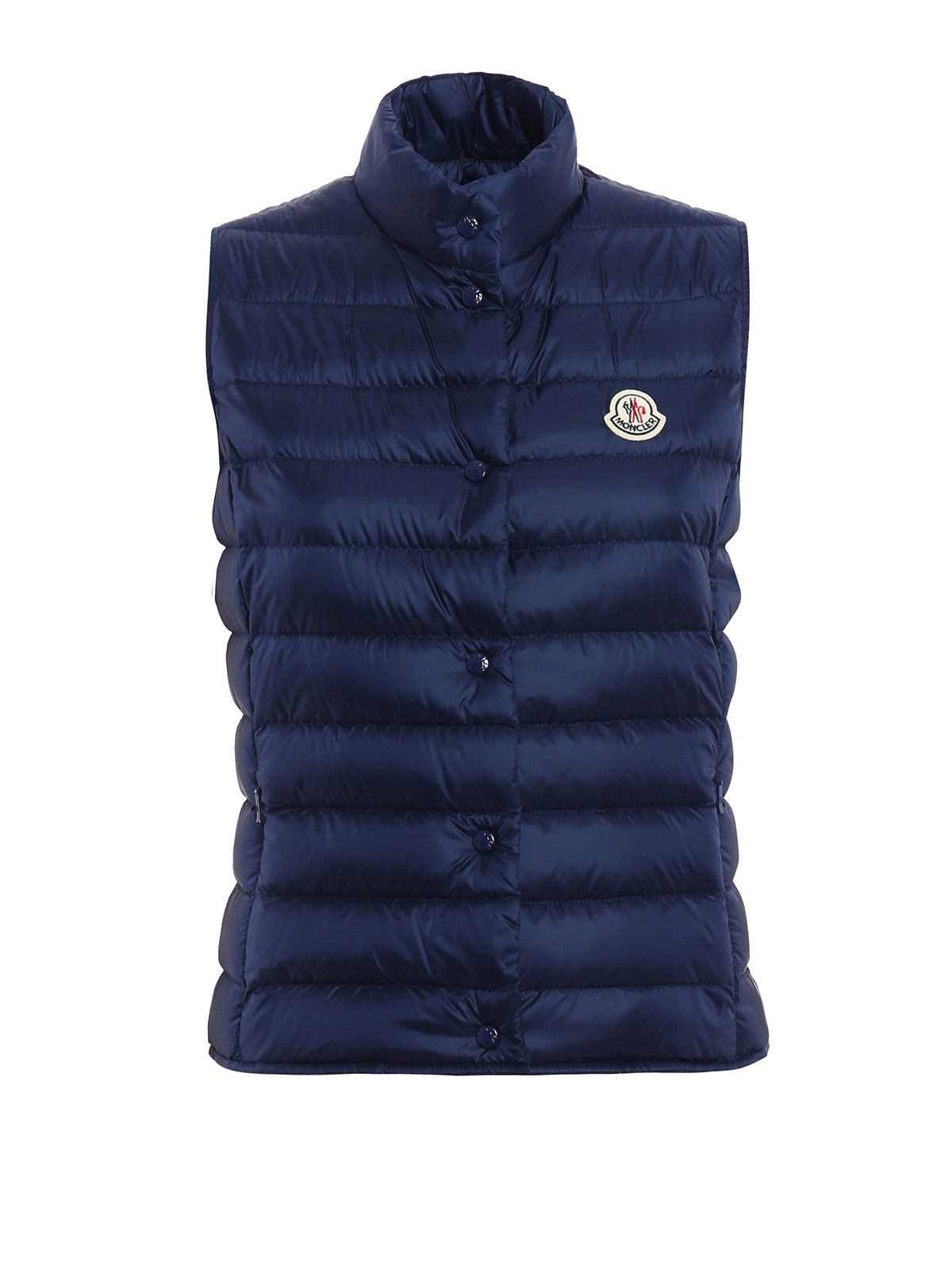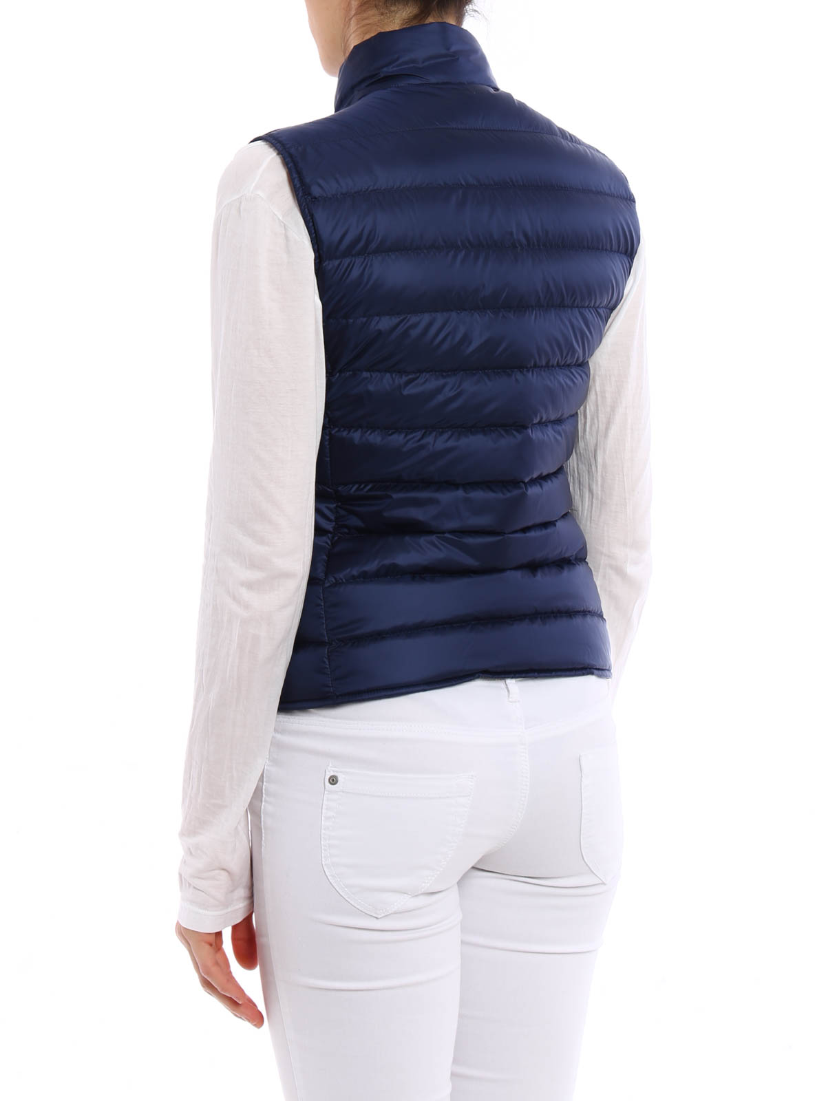 Ultralight down padded nylon sleeveless jacket detailed with standing collar, tonal snap button fastening, seam zipped welt pockets, logo patch to the chest. Item of the Longue Saison collection. Pocketable in its signature nylon bag.