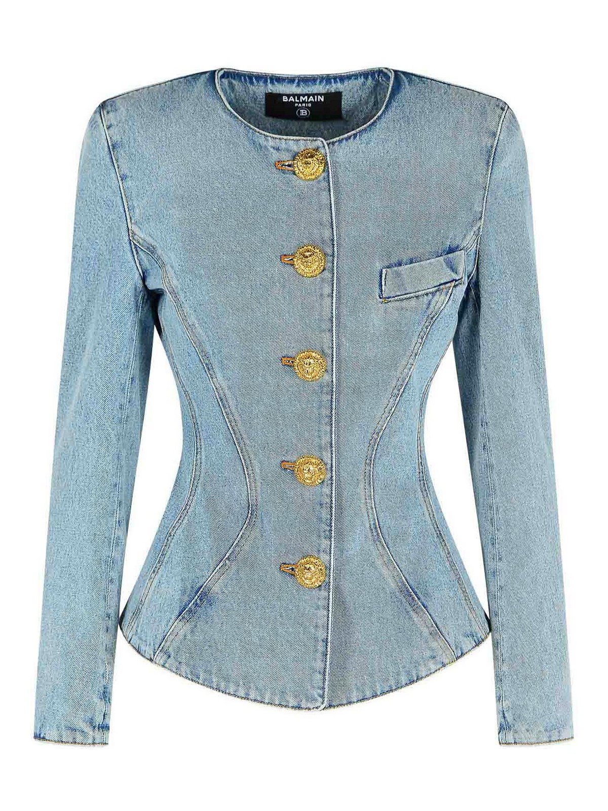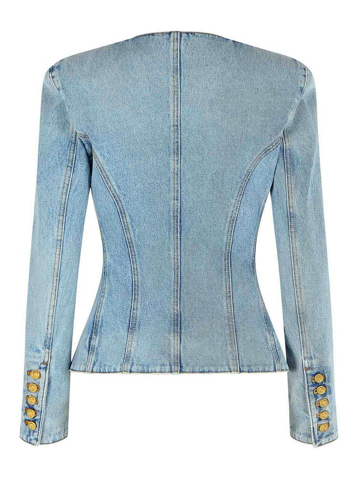 Crew neck decorated button welt chest pocket padded shoulders narrow waist button cuffs flared hem